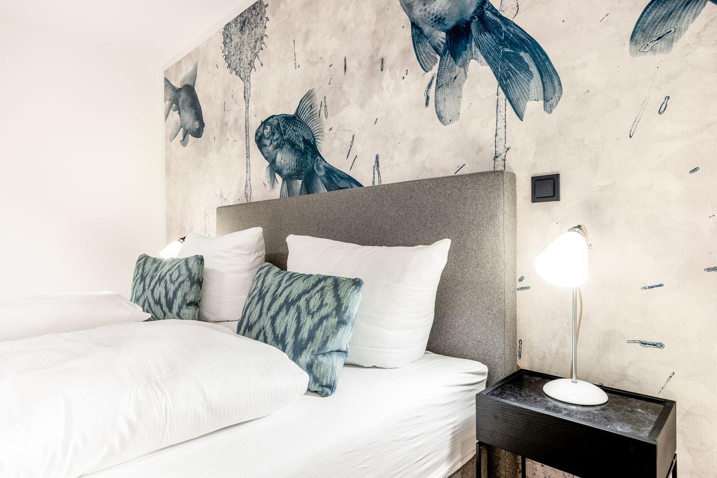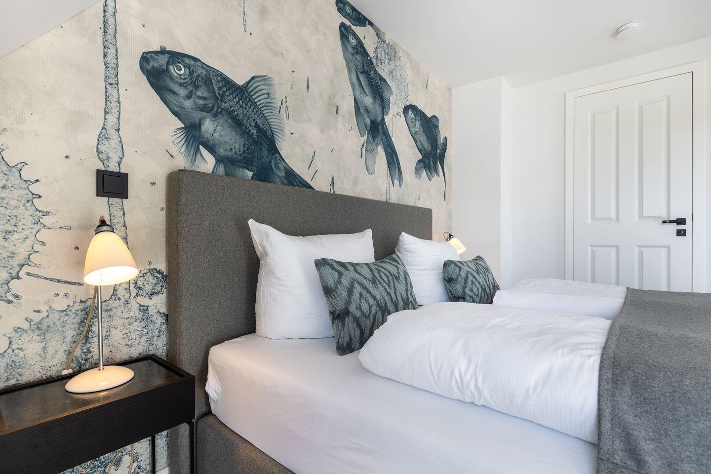 Das Schlafzimmer im Souterrain kann nicht nur mit einem hochwertigen Boxspringbett, sondern auch mit einem echten Wow-Effekt in Form einer coolen Tapete aufwarten. Und weil's so schön ist, findet sich diese stimmige Kombination auch in dem Schlafzimmer im ersten Obergeschoss wieder.