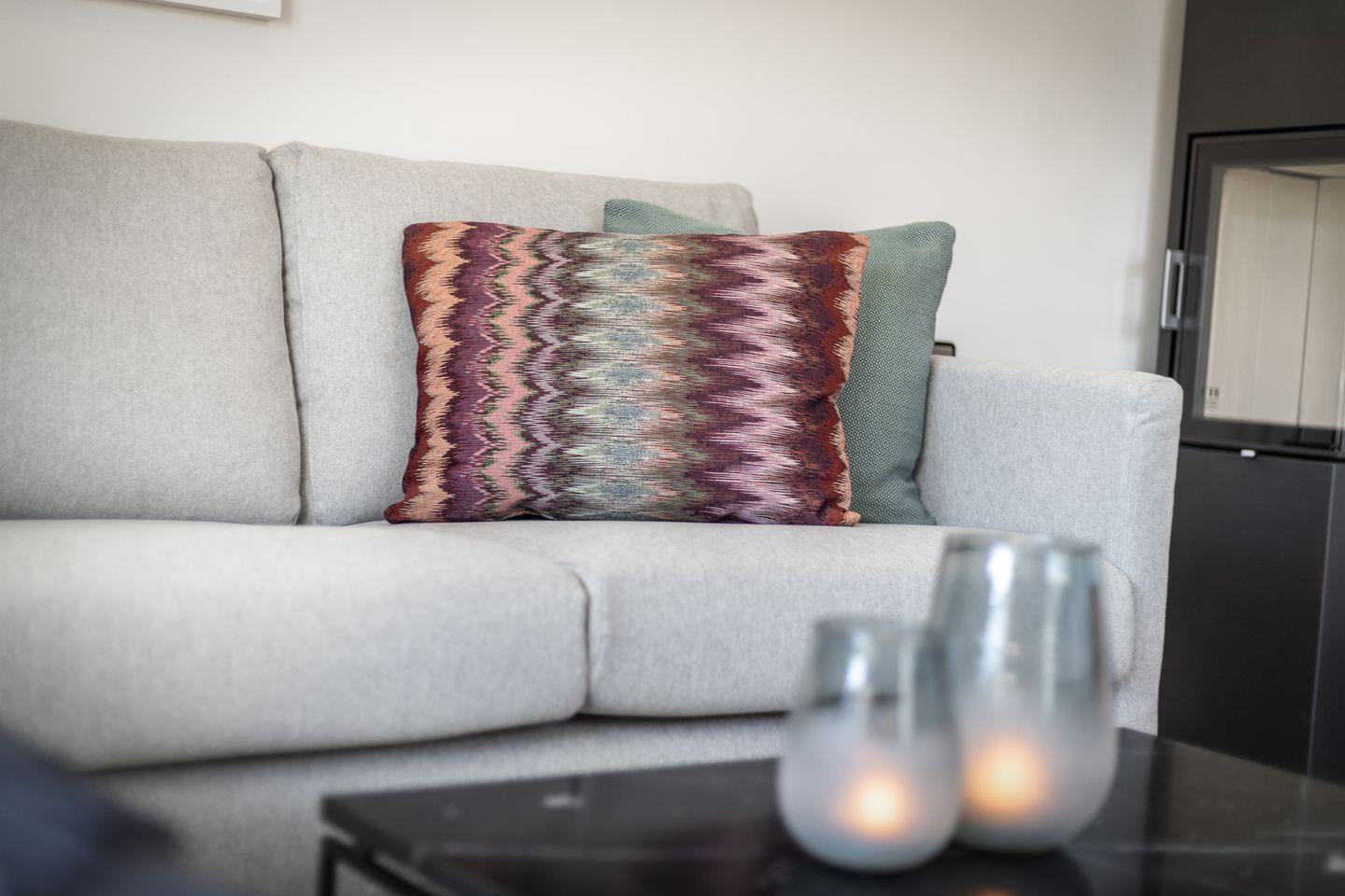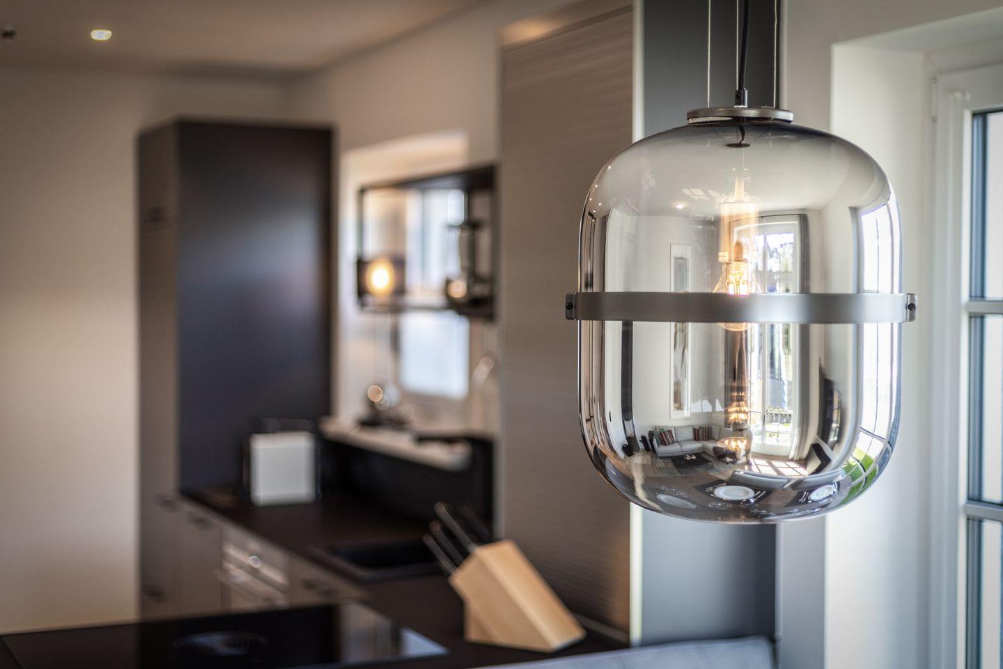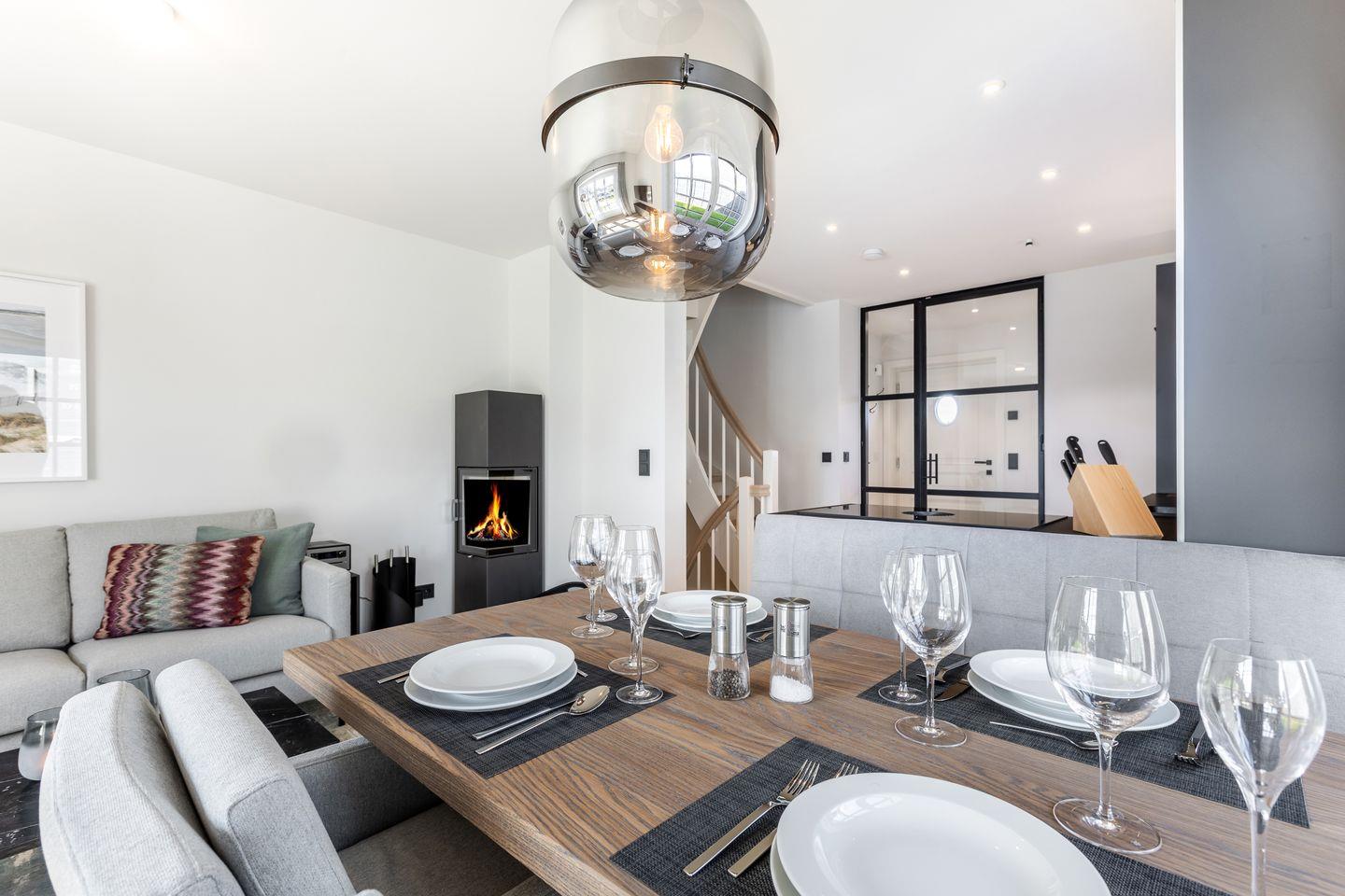 Schick, schick: Der lichtdurchflutete Wohnbereich im Erdgeschoss lässt bereits erahnen, dass im Dikhus inpuncto Style nichts dem Zufall überlassen wurde. Während die markante Stahl-Glaswand und die schwarze Küche für Loft-Flair sorgen, punkten das gemütliche Sofa, liebevoll ausgesuchte Accessoires sowie der Kamin mit ultimativer Gemütlichkeit. Bodentiefe Fenster bilden den Austritt auf die kleine Südterrasse, die mit ihrem Strandkorb zu herrlichen Sonnenstunden einlädt.