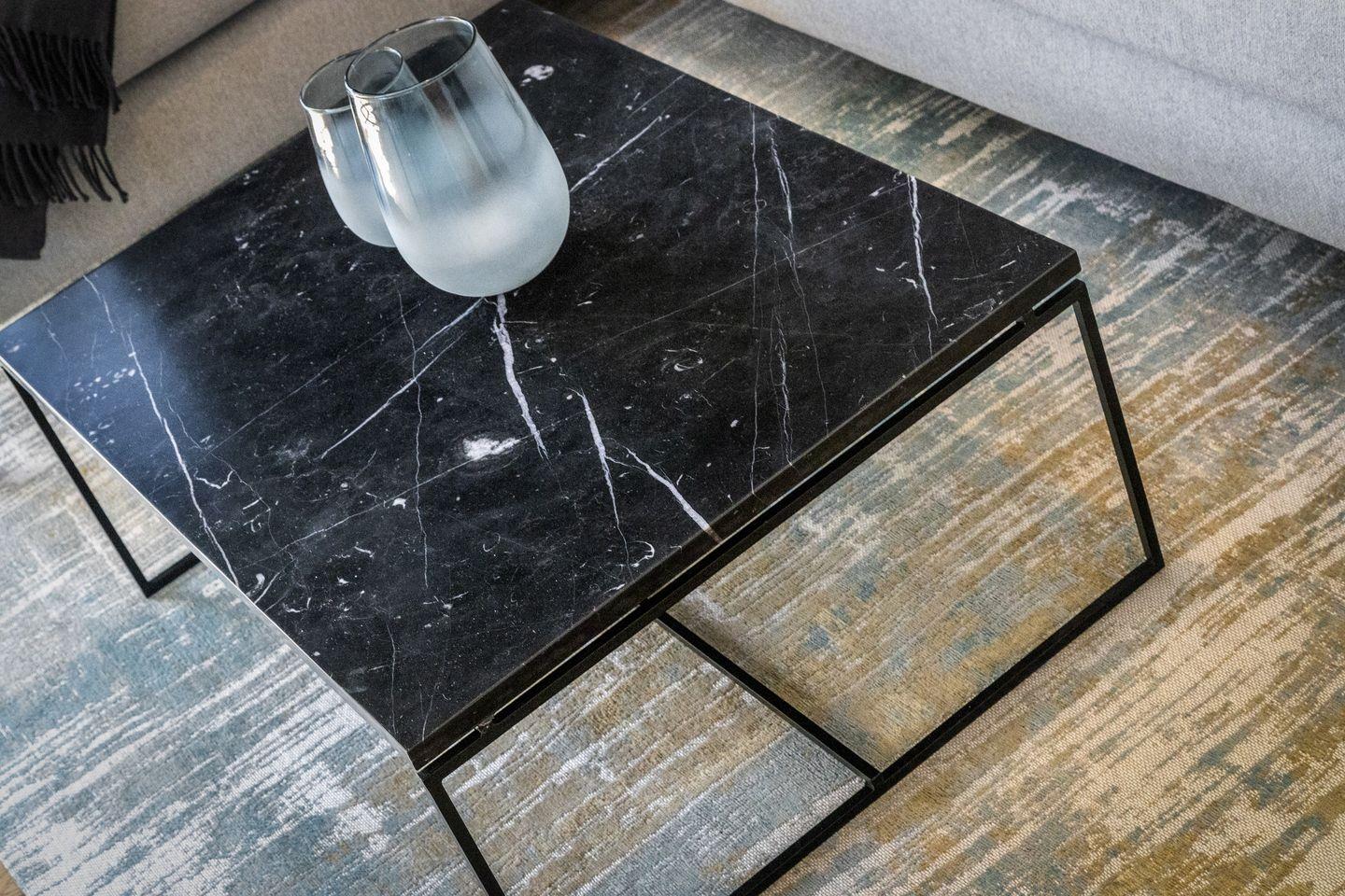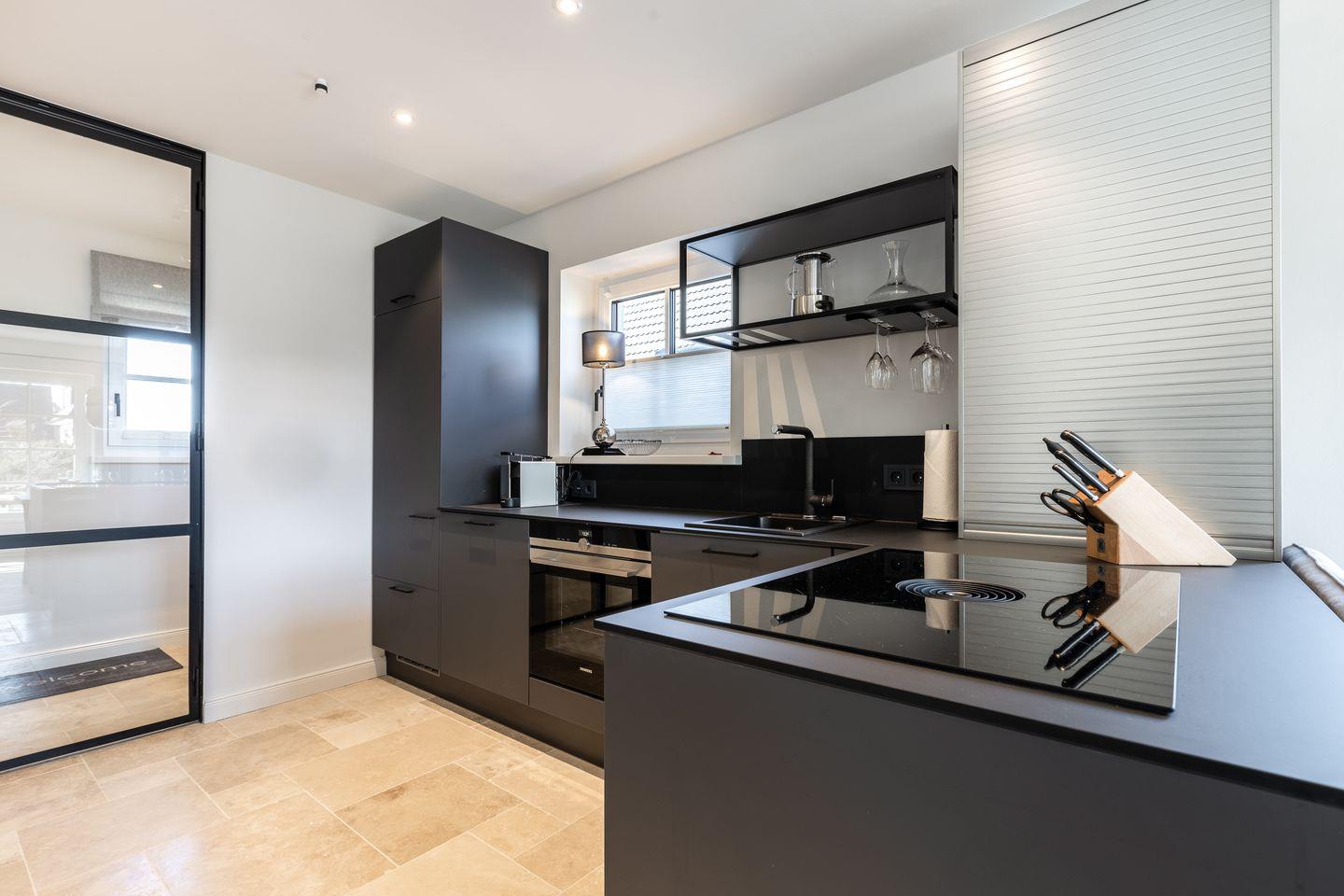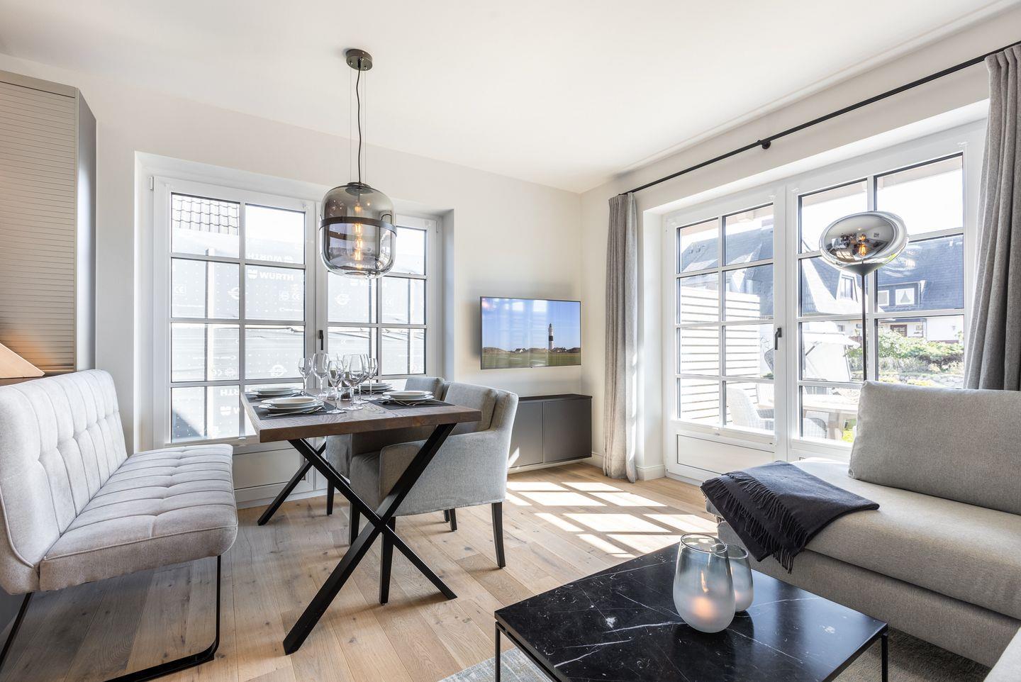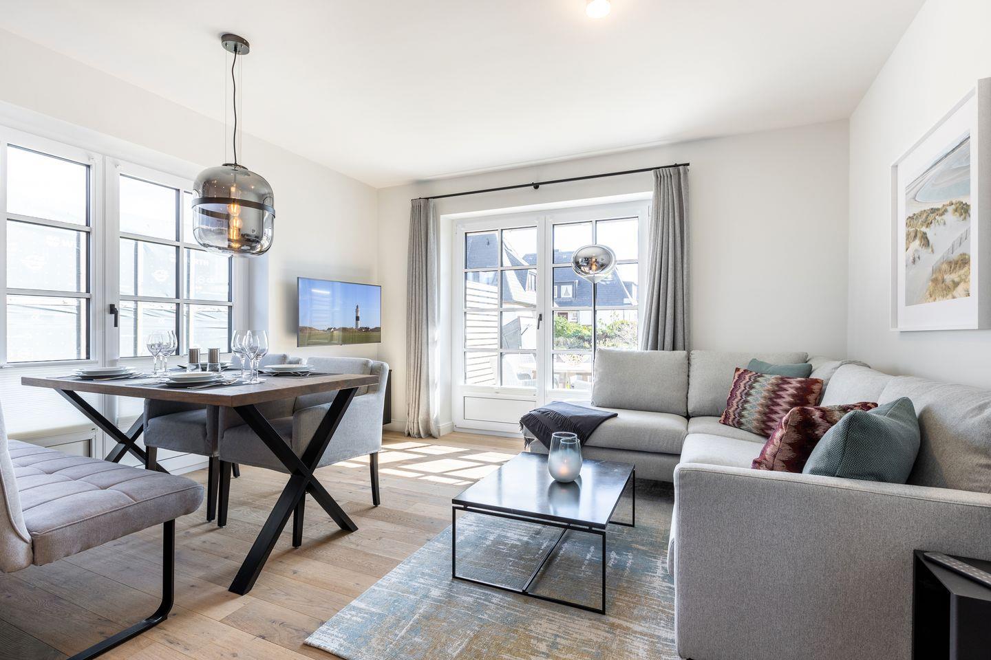 Schick, schick: Der lichtdurchflutete Wohnbereich im Erdgeschoss lässt bereits erahnen, dass im Dikhus inpuncto Style nichts dem Zufall überlassen wurde. Während die markante Stahl-Glaswand und die schwarze Küche für Loft-Flair sorgen, punkten das gemütliche Sofa, liebevoll ausgesuchte Accessoires sowie der Kamin mit ultimativer Gemütlichkeit. Bodentiefe Fenster bilden den Austritt auf die kleine Südterrasse, die mit ihrem Strandkorb zu herrlichen Sonnenstunden einlädt.