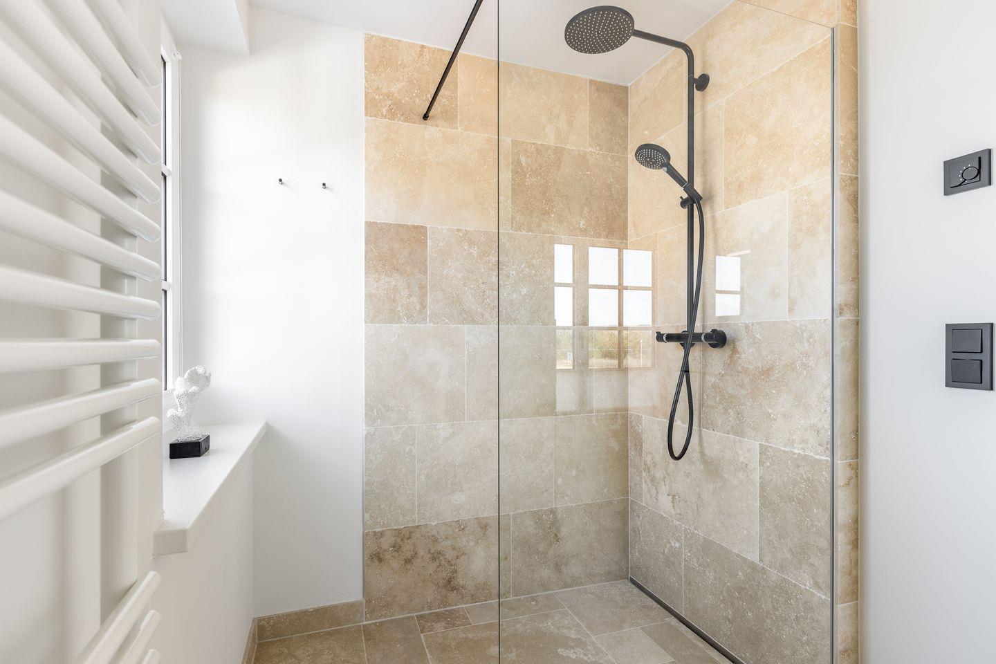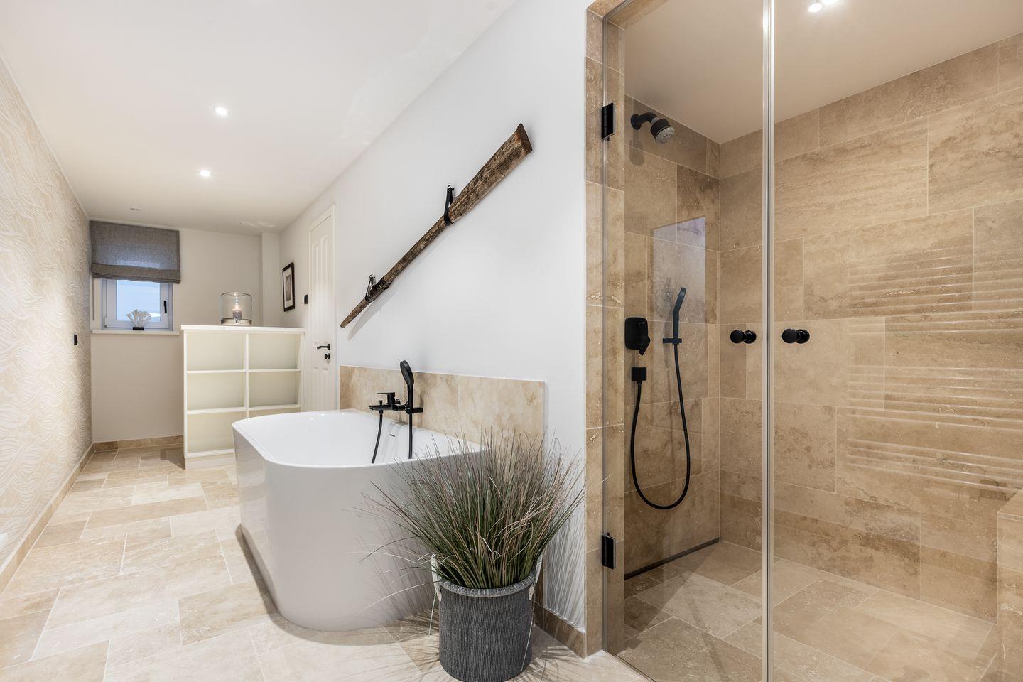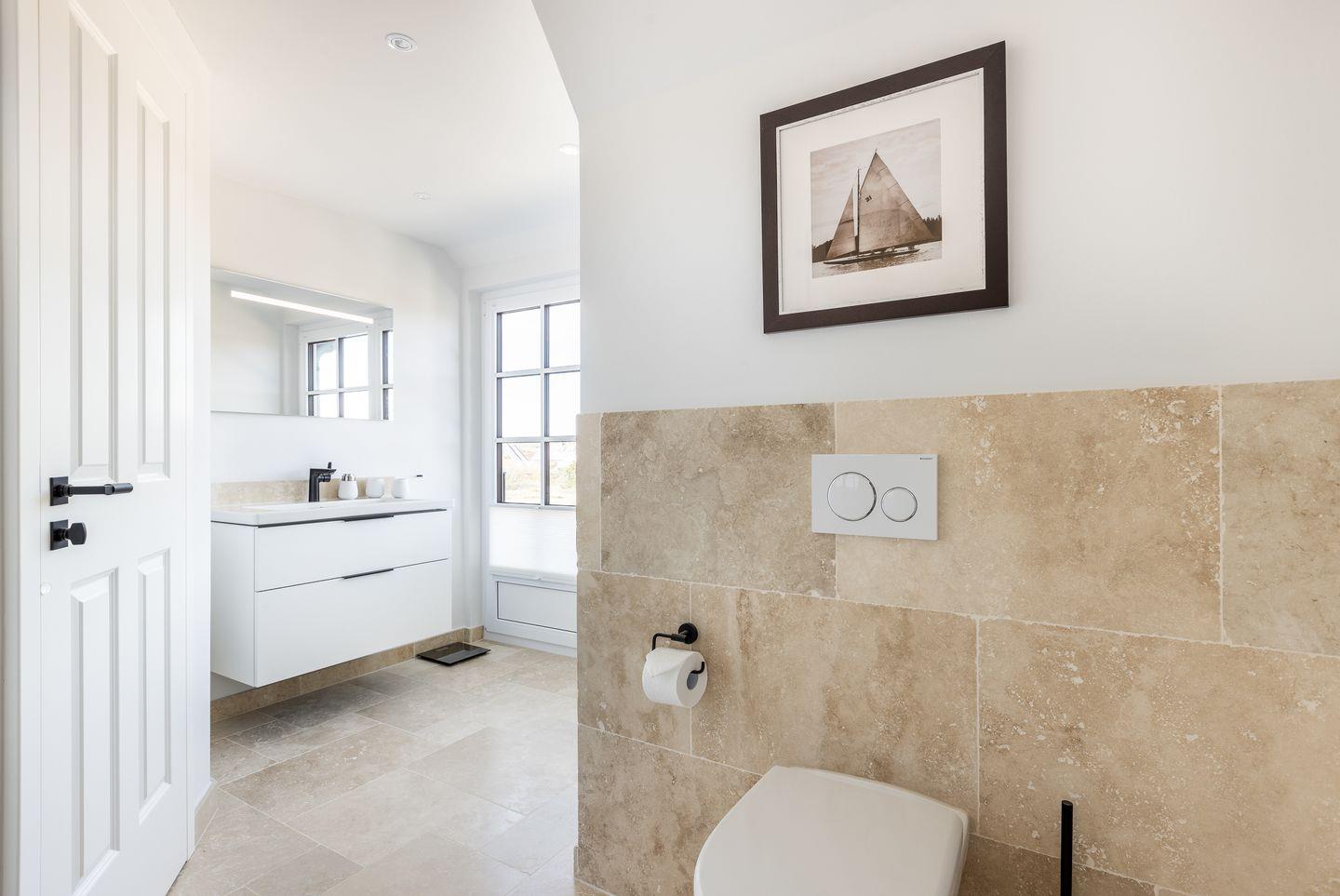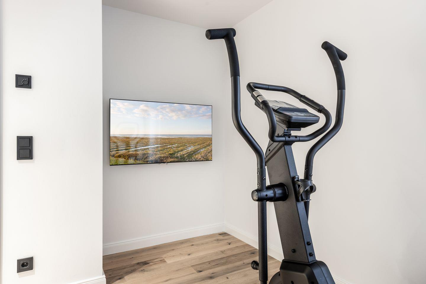 Eine weitere Gemeinsamkeit sind die beiden geräumigen Bäder mit ihren hellen Natursteinfliesen. Während jedoch das Duschbad im ersten OG mit einem herrlichen Blick in die Natur auftrumpft, verfügt das Bad im Souterrain nicht nur über eine Badewanne, sondern auch über eine Dusche mit integrierter Dampfsauna! Ein weiteres Highlight hier ist der kleine Fitnessraum, der zu einem Workout auf dem Crosstrainer, zum Yoga oder Muskelaufbau mit Hanteln einlädt.