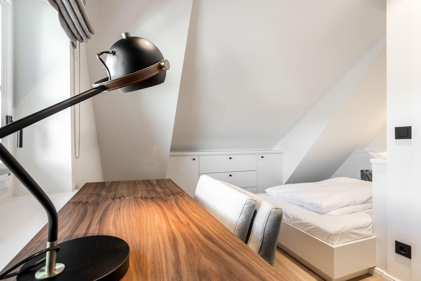 Last but not least befindet sich unter dem Dach noch ein Schlafzimmer, dessen Schrägen für gemütliche Geborgenheit sorgen und dank des kleinen Schreibtischs lässt es sich hier auch hervorragend arbeiten - wenn es denn sein muss.