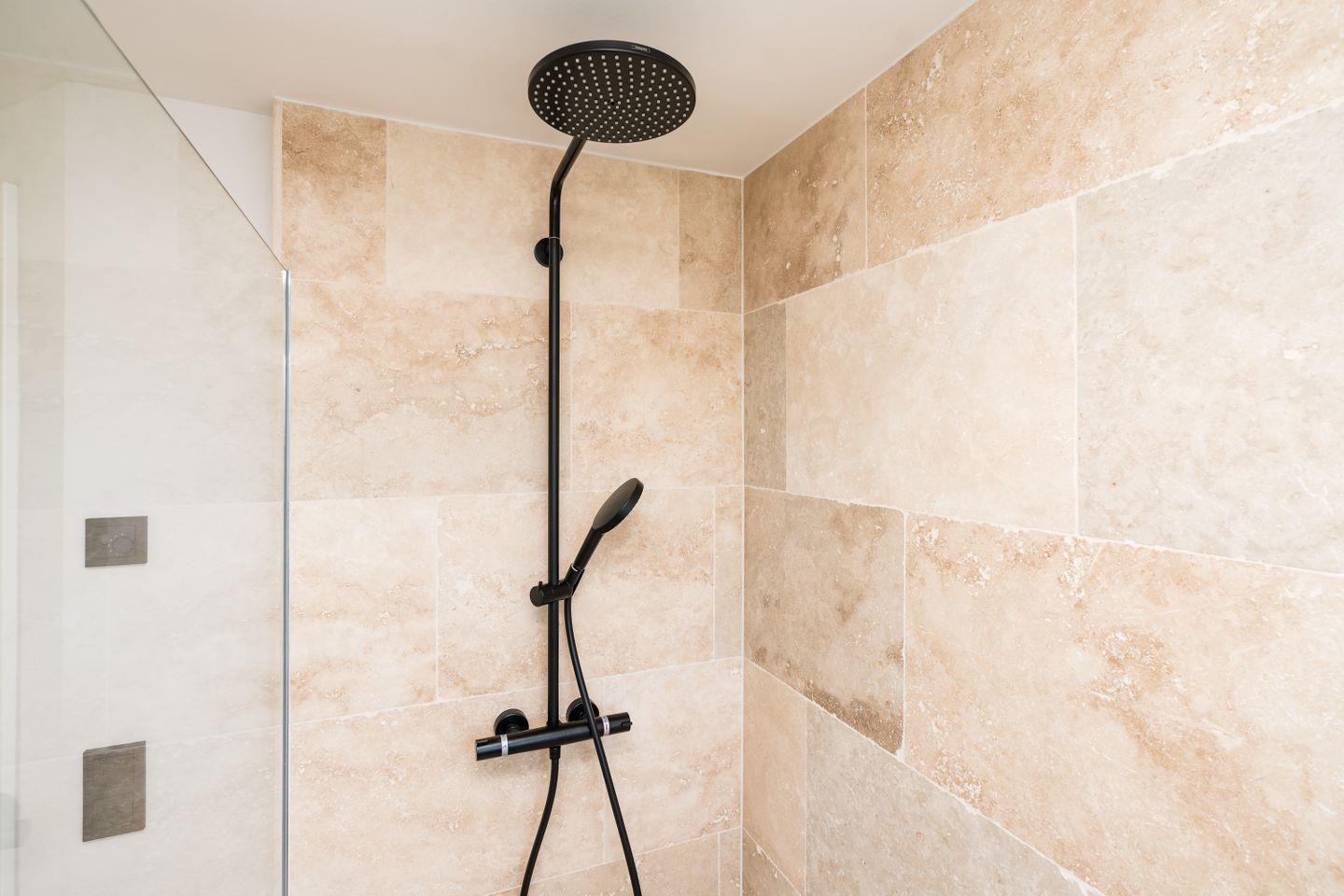 Eine weitere Gemeinsamkeit sind die beiden geräumigen Bäder mit ihren hellen Natursteinfliesen. Während jedoch das Duschbad im ersten OG mit einem herrlichen Blick in die Natur auftrumpft, verfügt das Bad im Souterrain nicht nur über eine Badewanne, sondern auch über eine Dusche mit integrierter Dampfsauna!