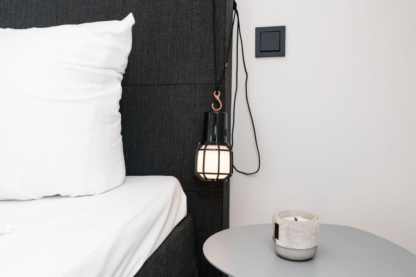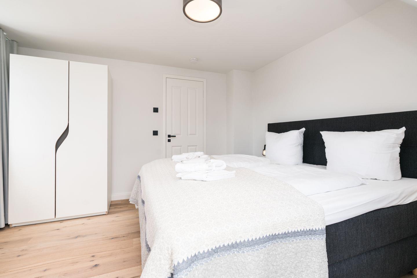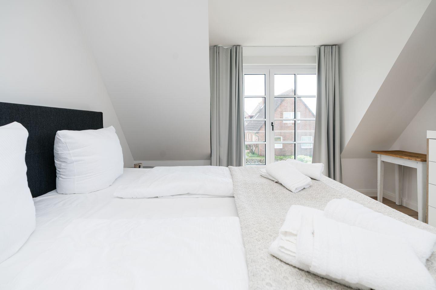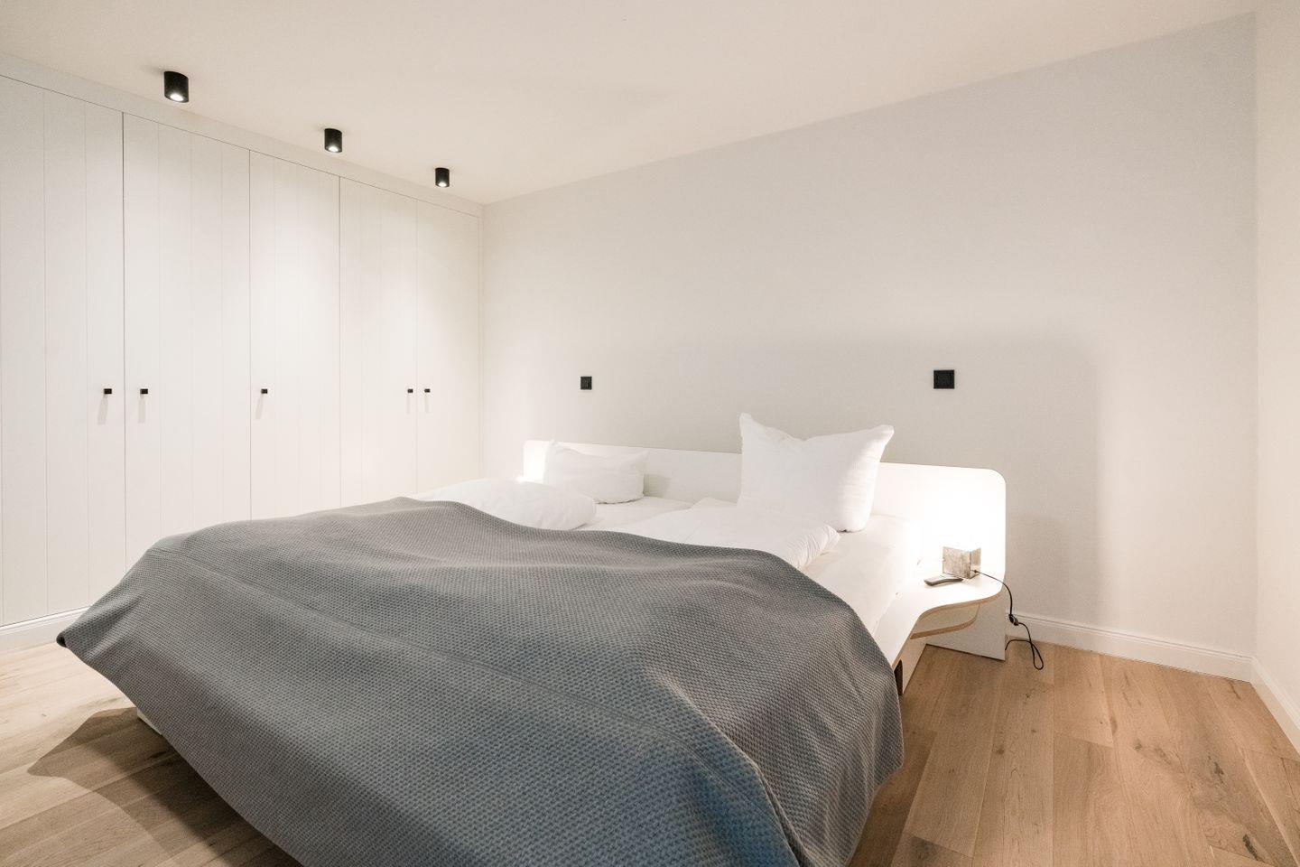 Die beiden Schlafzimmer im Souterrain sind komplett in Weiß gehalten und laden mit hochwertigen Betten zum relaxen und träumen ein. Ähnlich sieht es auch im Schlafzimmer im Obergeschoss aus, in dessen Mittelpunkt ein gemütliches Boxspringbett steht.