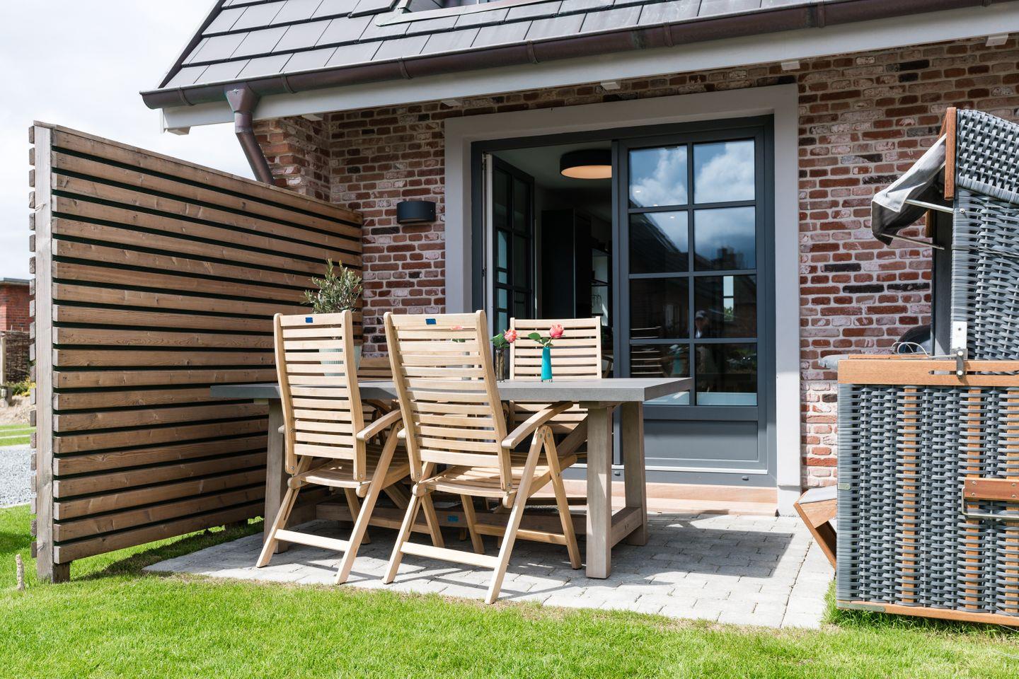 Im Erdgeschoss bilden der Wohn- und Essbereich eine harmonische und luftig helle Einheit. Während die markante Stahl-Glaswand und die schwarze Küche für Loft-Flair sorgen, punkten das gemütliche Sofa, liebevoll ausgesuchte Accessoires sowie der Kamin mit ultimativer Gemütlichkeit. Bodentiefe Fenster bilden den Austritt auf die kleine Südterrasse, die mit ihrem Strandkorb zu herrlichen Sonnenstunden einlädt.