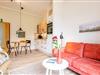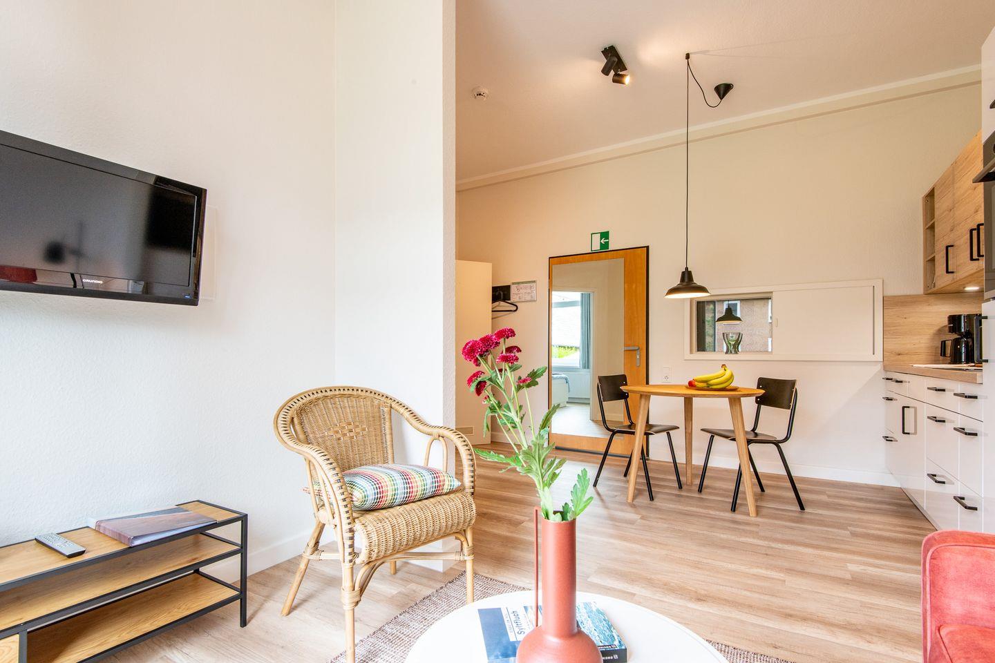- Der Wohnbereich lädt mit Sofa, Sessel und Fernsehgerät zum Verweilen ein.