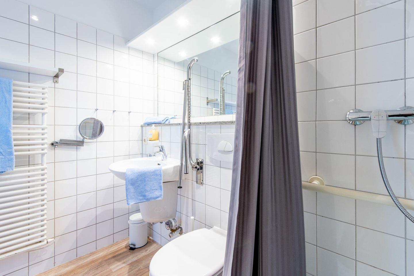 Das Badezimmer ist mit einer bodengleichen Dusche, einem Waschbecken, einem WC mit Haltegriffen und einer Handtuchheizung ausgestattet.