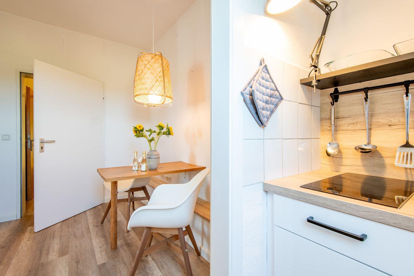 Im Eingangsbereich ist viel Stauraum mit Einbauschränken. Von hier aus kommen Sie in den Essbereich mit einem Tisch und zwei Stühlen. Direkt an den Essbereich schließt sich die kleine Küche an. Sie ist mit einem kleinen Ceran-Kochfeld, Kühlschrank und Mikrowelle ausgestattet. Kochutensilien und Geschirr gehören zum Inventar.