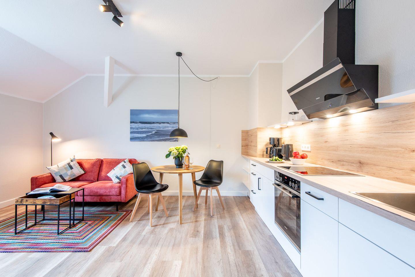 Im Wohnbereich finden Sie ein gemütliches Sofa und ein TV-Gerät. Hier ist auch die Küchenzeile und eine kleine Essecke mit einem Tisch und zwei Stühlen.