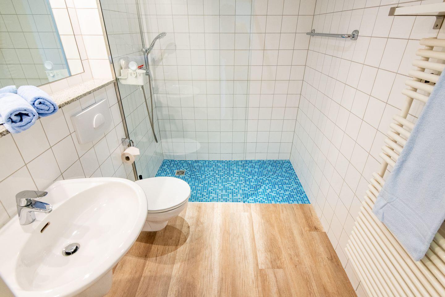 Vom Eingangsbereich aus erreichen Sie das Badezimmer (dieses ist mit einer bodengleichen Dusche, WC, Waschbecken und einer Handtuchheizung ausgestattet), die Wohn-Küche mit Essbereich