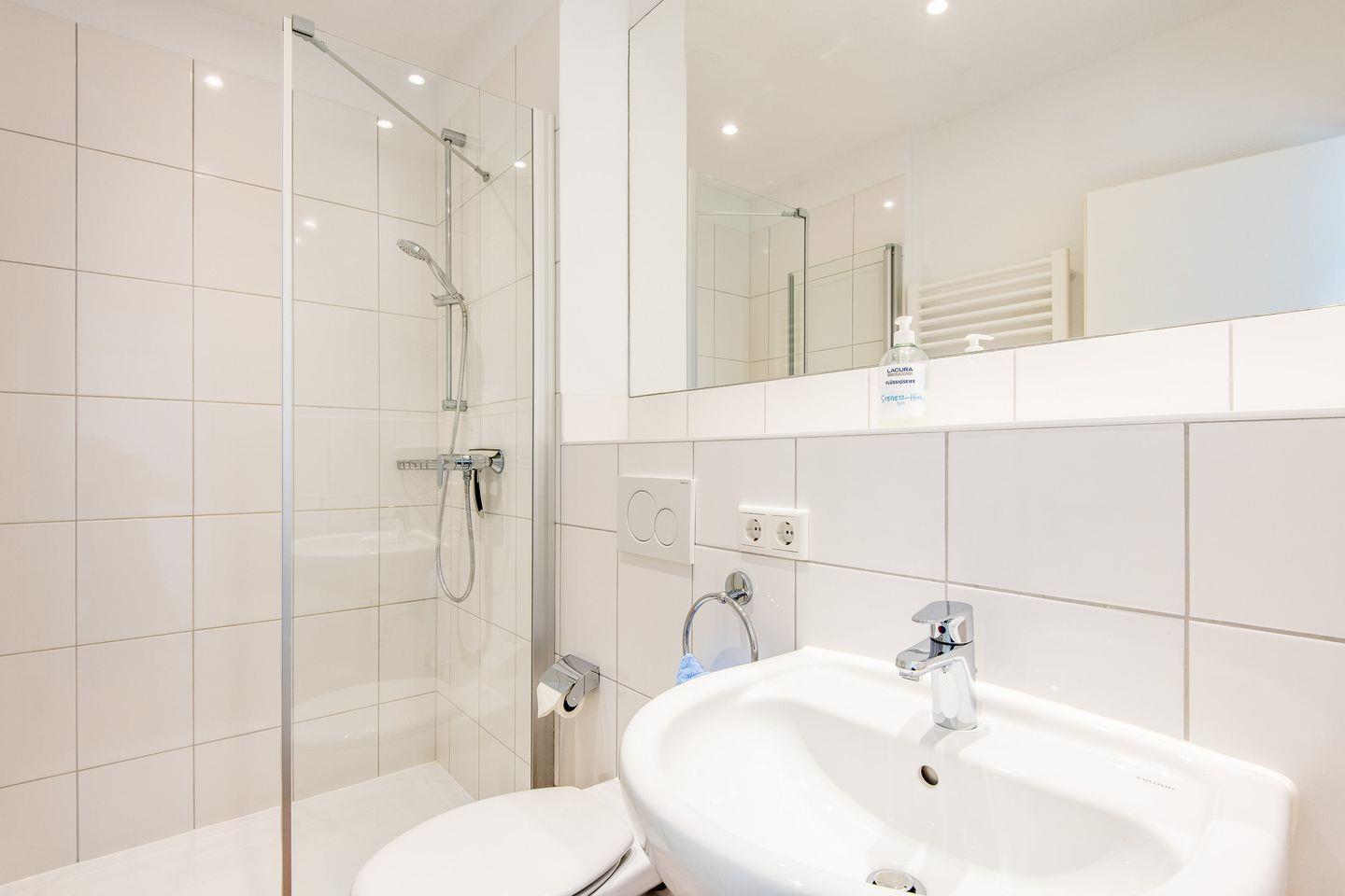 Die Wohnung verfügt über ein Badezimmer, welches mit einer bodengleichen Dusche, einem WC, einem Waschbecken und einer Handtuchheizung ausgestattet ist.