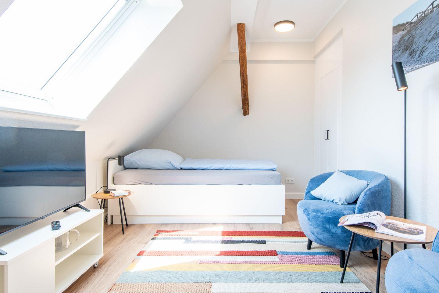 Im geräumigen Wohn-Schlafbereich befindet sich ein kleiner Wohnbereich, das bequeme breites Bett 140x200cm, ein Essbereich und eine kleine Küchenzeile.