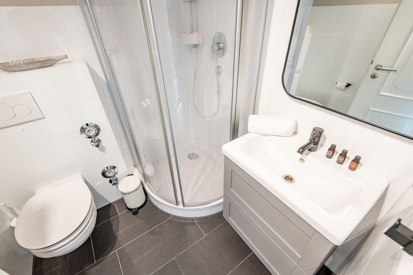 Das moderne Badezimmer ist mit einer geräumigen Dusche und einem großen Spiegel ausgestattet und bietet Ihnen die Möglichkeit, sich nach einem Tag voller Aktivitäten und Naturerlebnisse rundum zu erfrischen und zu entspannen.