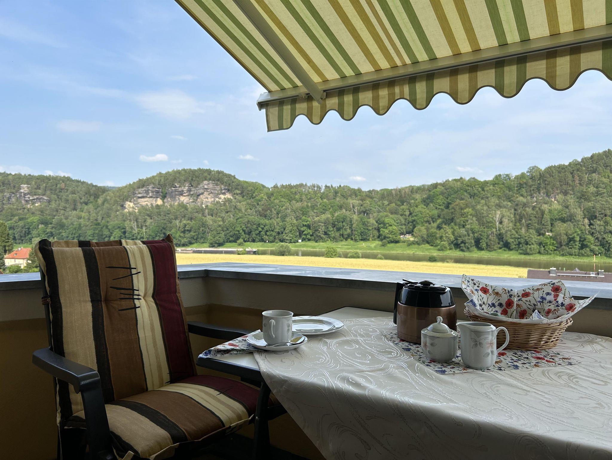 Unsere Ferienwohnung liegt etwas abseits vom Touristiktrubel - aber dafür mit herrlichem Ausblick vom Balkon auf die Elbe, den Lilienstein und die Festung Königstein.