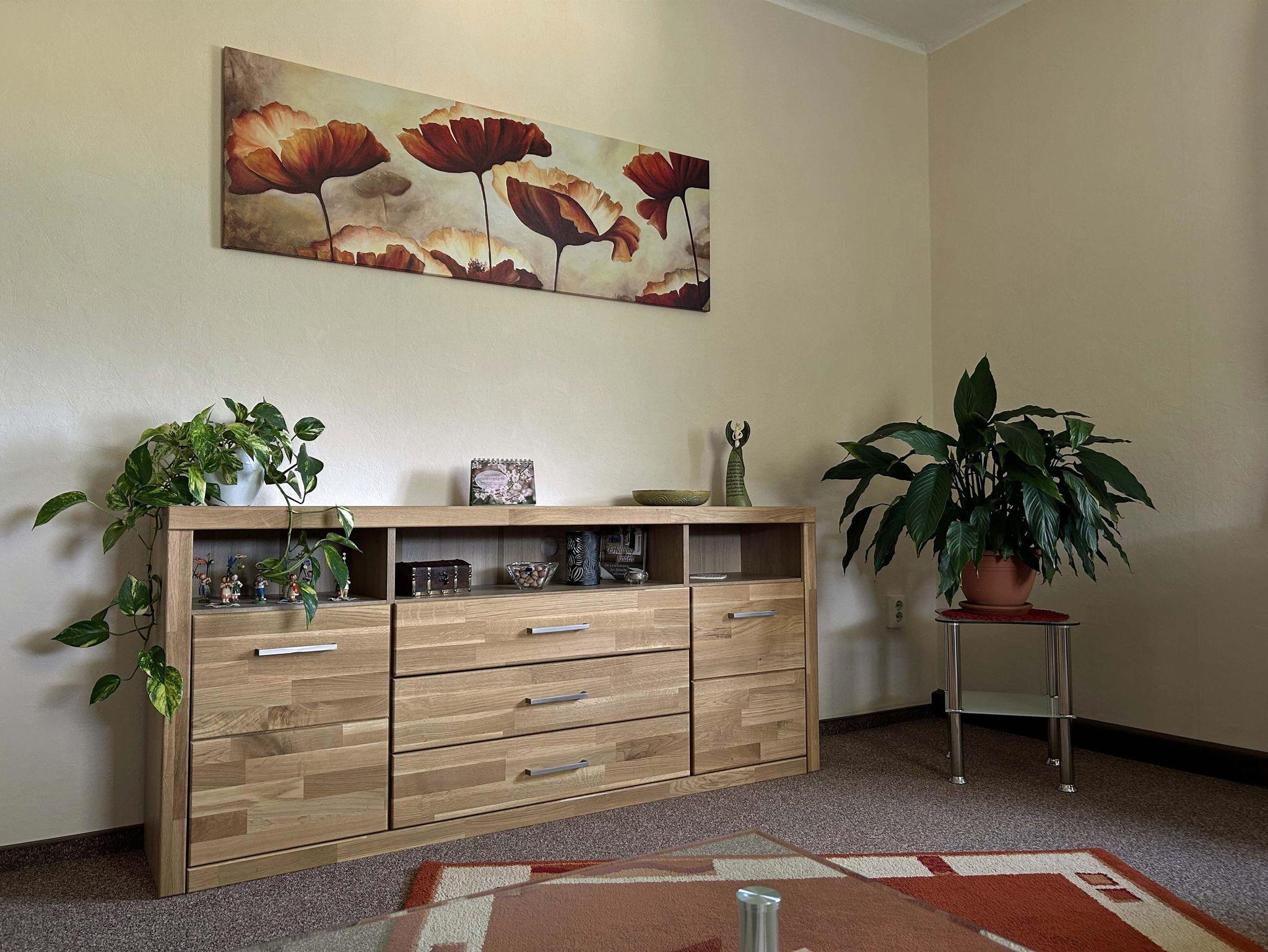 Die Ferienwohnung liegt in der 1. Etage und verfügt über einen separaten Schlafraum mit Doppelbett, einen Wohnraum, Küche sowie ein Bademzimmer mit ebenerdiger Dusche und WC. Der Wohnraum ist mit einer gemütlichen Couch, auf der zwei weitere Schlafmöglichkeiten bestehen und TV eingerichtet. Die separate Küche ist mit einer Essecke für 4 Personen und einer Küchenzeile mit Cerankochfeld, Kühlschrank, Kaffeemaschine, Wasserkocher und Mikrowelle ausgestattet.