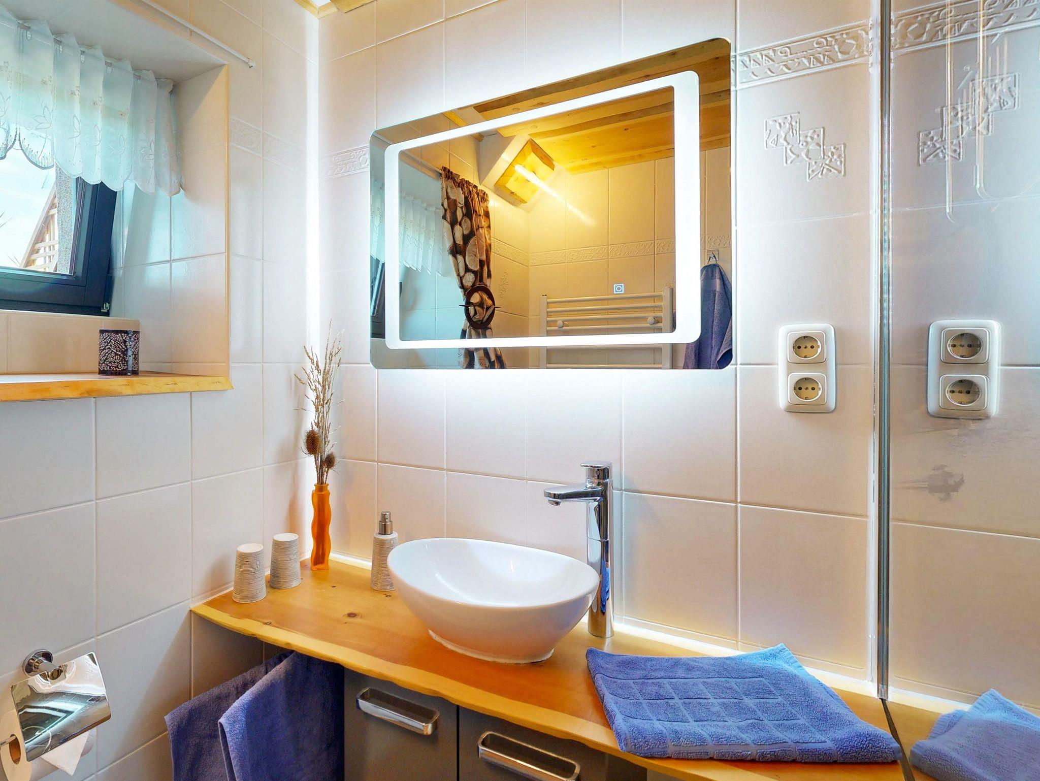 Das moderne Badezimmer ist mit einer Regenwalddusche, Waschtisch mit beheizbarem Spiegel, Handtuchheizkörper, WC und einer Zirbenholzdecke ausgestattet.