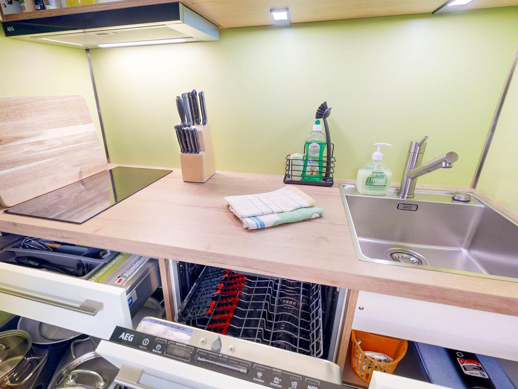 Das separate Schlafzimmer bietet Ihnen ein luxuriöses Boxspringbett (180x200) für höchsten Schlafkomfort. Die neue hochwertige Einbauküche ist mit Cerankochfeld und Abzugshaube, Backofen, Geschirrspüler, großem Kühlschrank mit Gefrierfach, Kaffeemaschine, Toaster und Wasserkocher ausgestattet. Die gemütliche Sitzecke mit Tisch und 2 Stühlen lädt zu gemeinsamen Mahlzeiten oder Spieleabenden ein.