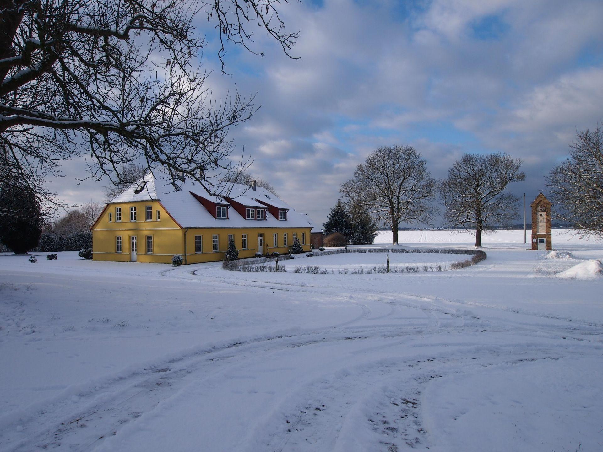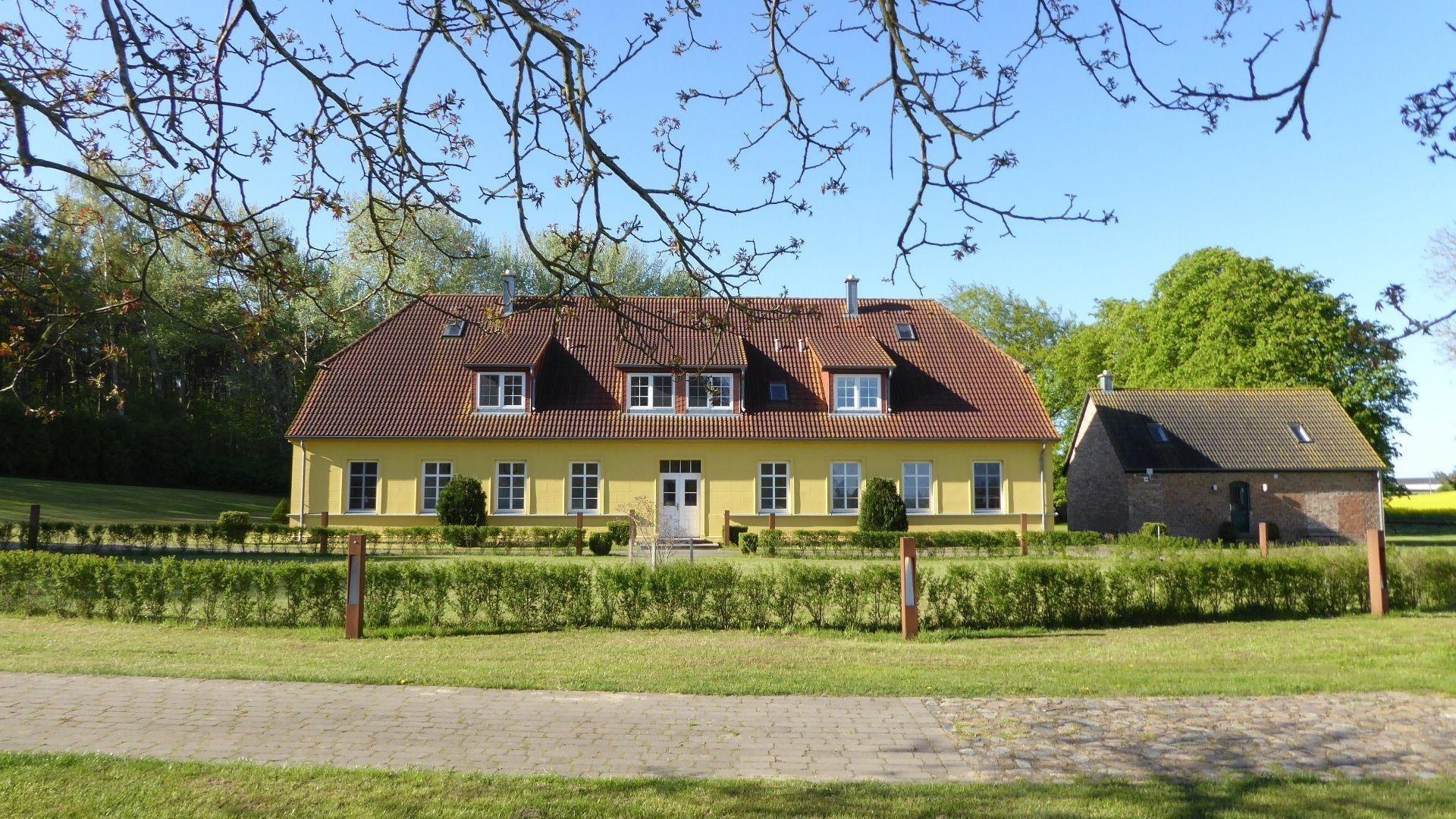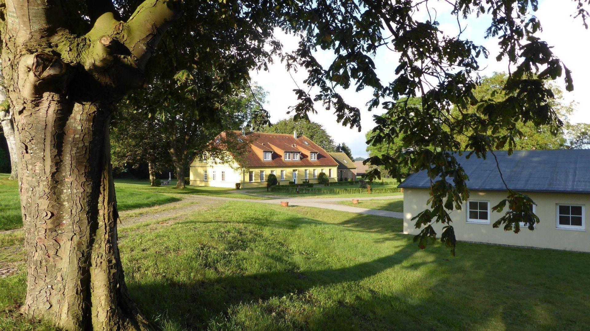 Das Gut liegt zwischen eigenem Wasser Wald und Feldern am Varbelvitzer Bodden.