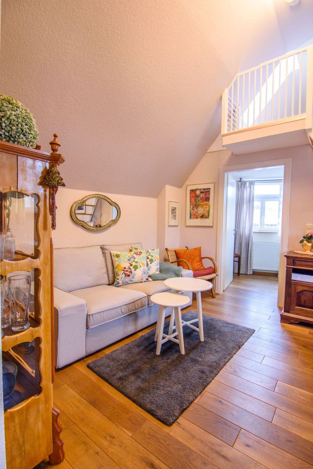 Our holiday flat 1 is located in a converted part of the outbuildings from the 19th century. The former granary has been lovingly converted and transformed into a cosy flat in a stylish country house style. This cosy flat offers you space for a relaxing holiday for two or a business stay. It has a shower room with walk-in shower, a separate bedroom, a fully equipped kitchen and a living/dining area with access to the sleeping loft, which can be used as additional sleeping accommodation. You are welcome to use the seating in the courtyard and garden.