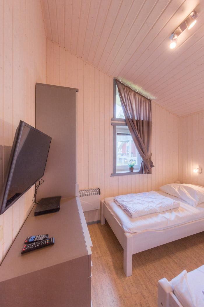 Das Ferienhaus im skandinavischen Stil bietet Platz für bis zu 4 Personen auf einer Etage mit 2 Schlafzimmern, Wohn-/Essbereich, Einbauküche, Badezimmer mit Sauna und Whirlpool, Terrasse und PKW-Stellplatz.