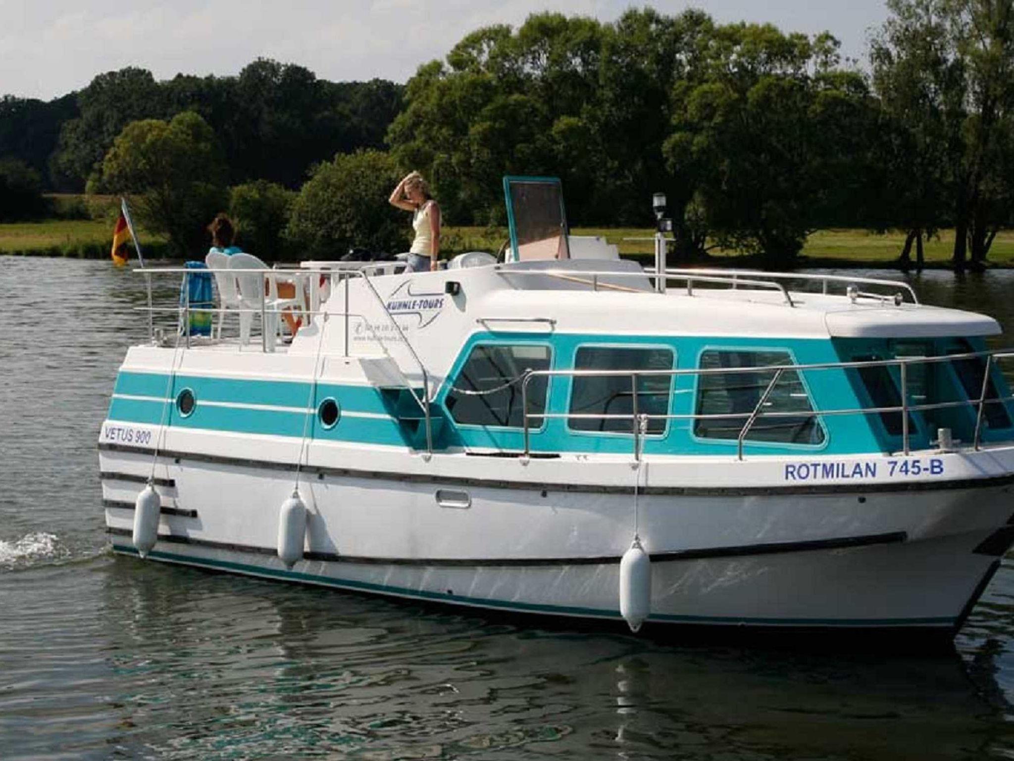 Modernes Hausboot im Yachtstil, Salon und Steuerstand bilden einen großen Raum, zweiter Steuerstand auf dem Sonnendeck, Heckplattform mit Badeleiter, Warmluftheizung, Pantry, zweite Außentür, Bugstrahlruder, Anschluss für Landstrom und iPod, MP3-Player oder Laptop, Schmutzwassertank 800 l. Einige vetus 900 aus unserer Flotte sind jetzt mit 15 PS / 11,03 kW Motor ausgestattet und damit in allen deutschen Binnenrevieren führerscheinfrei.