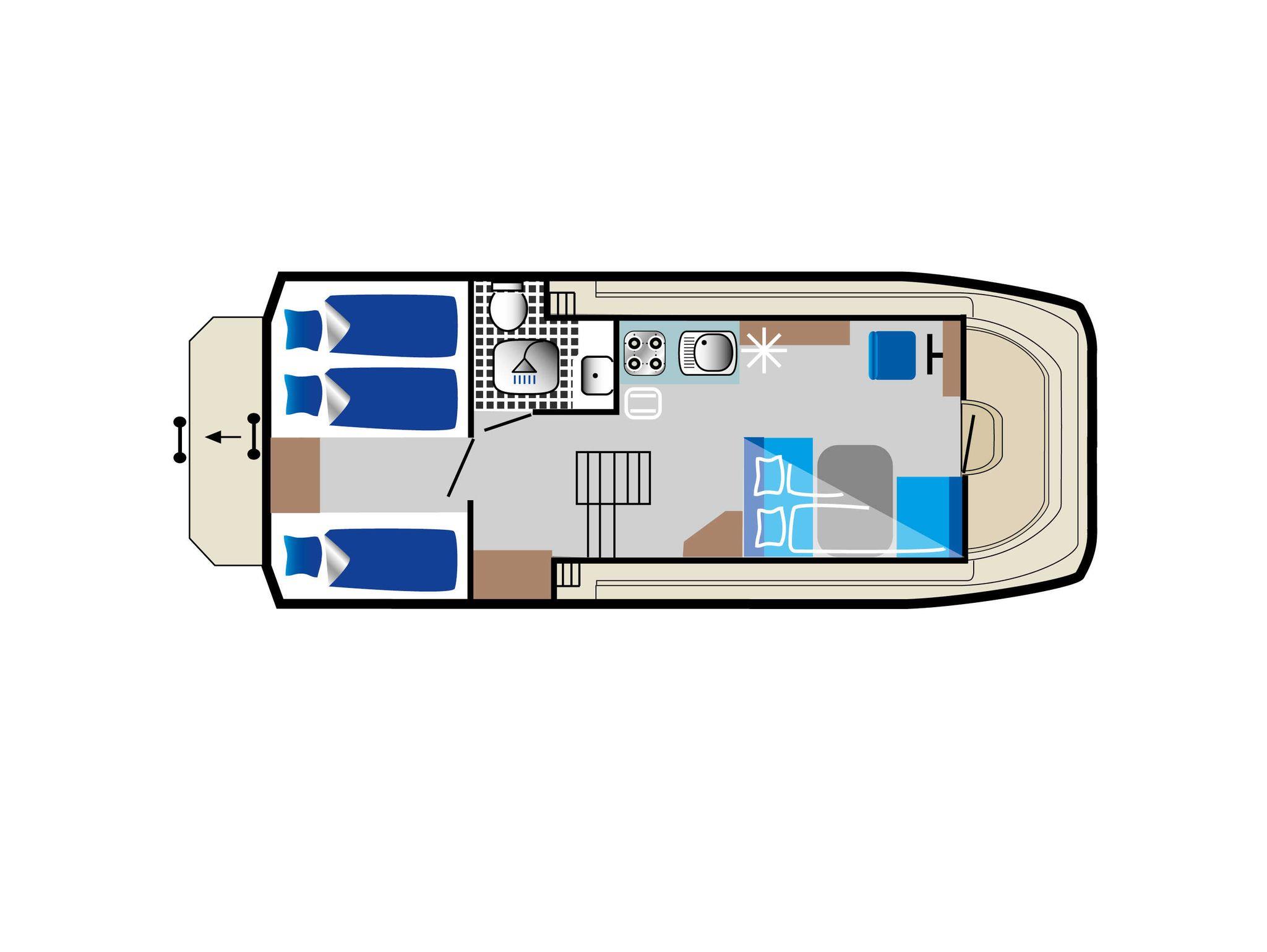 Heckkabine mit einer Einzel- und einer Doppelkoje, ideales Boot für Paare oder kleine Familien, Nasszelle mittschiffs.