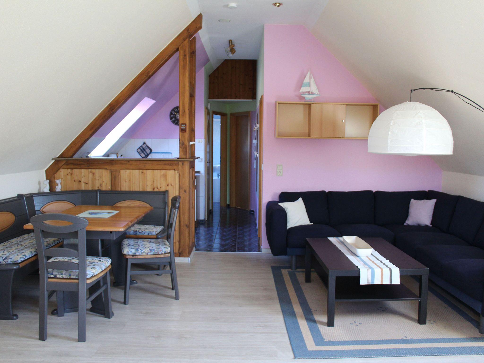 Nichtraucher-Ferienhaus (ca. 56 m²) im DG eines separaten Gebäudes (im EG sind Garagen) mit Platz für 4 Personen und einem Kleinkind bis 3 Jahre (Kinderbett und Hochstuhl inklusive) einem 1000 m² großem Grundstück in unmittelbarer Nähe der Müritz (300 m). Im Schlafzimmer 1 gibt es ein Doppelbett und einen Kleiderschrank, auf Wunsch zusätzlich ein Kinder-Reisebett (für bis 15 Kilo Gewicht). Das zweite Schlafzimmer verfügt über 2 Einzelbetten (zusammenschiebbar) und eine Kommode. Im Bad finden Sie mit Dusche, WC, Waschbecken, Cremeseife, Waschmaschine, Kinder-WC-Sitz, Kinder-Tritthocker. Küche: Geschirrausstattung für 6 Personen, Ceranfeld 4-fach, Spülmaschine, Backofen, Kühlschrank, Mikrowelle, Kaffeepad-Maschine, Wasserkocher, Toaster, Handmixer…. Im Wohnzimmer mit Essecke gibt es einen großen Esstisch für 6 Personen und eine Sofaecke. Ein großer Flachbild-Fernseher sowie Radio