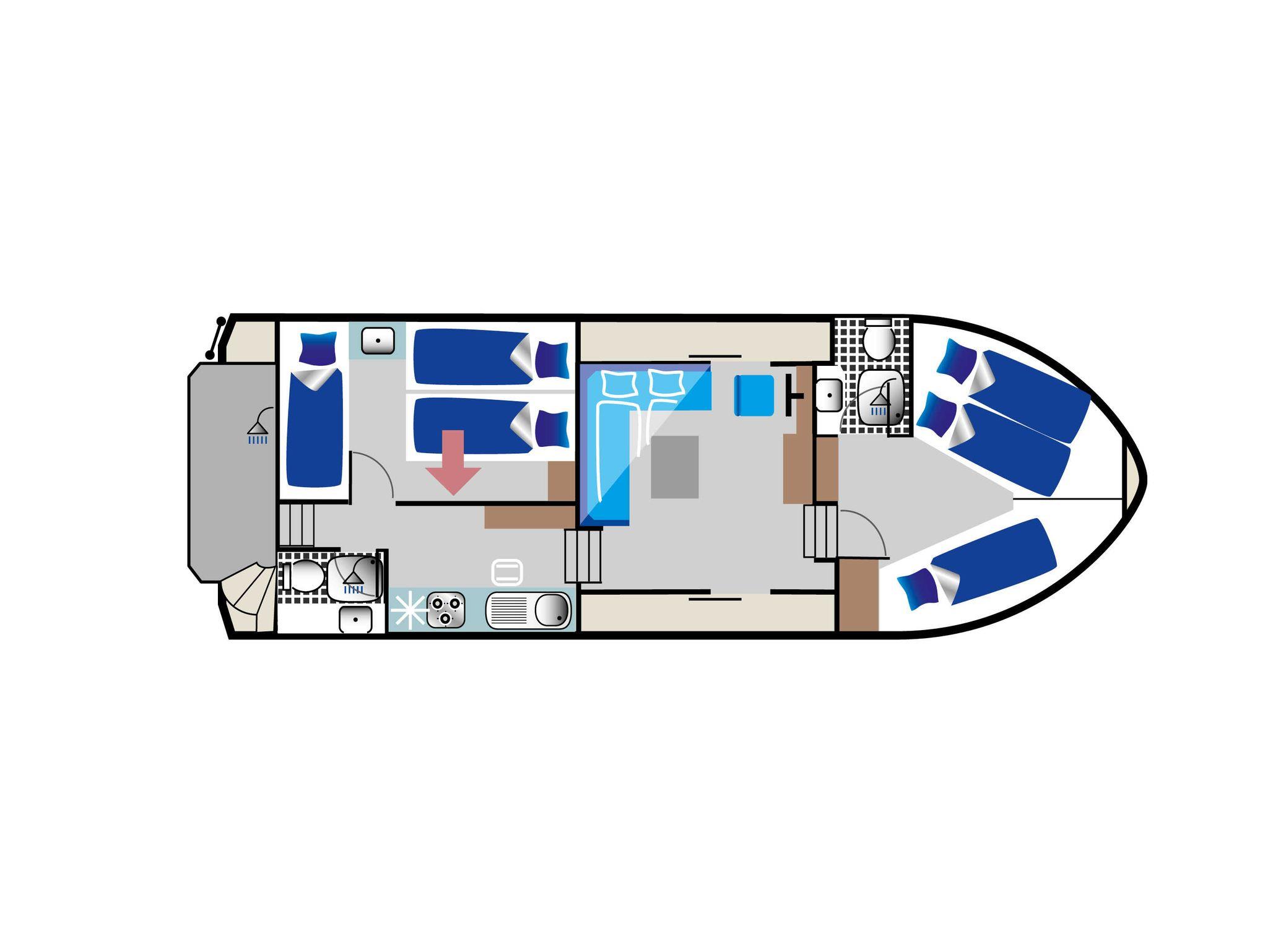 Die modern ausgestattete Kormoran 1150 ist das ideale Boot for zwei Paare oder eine Familie. Das Boot hat zwei Kabinen mit jeweils drei Betten. In der Kabine im Heckbereich können 2 Betten leicht zu einem Doppelbett umfunktioniert werden. Jede Kabine hat ein eigenes Bad und Salon und Pantry sind großzügig ausgestattet.