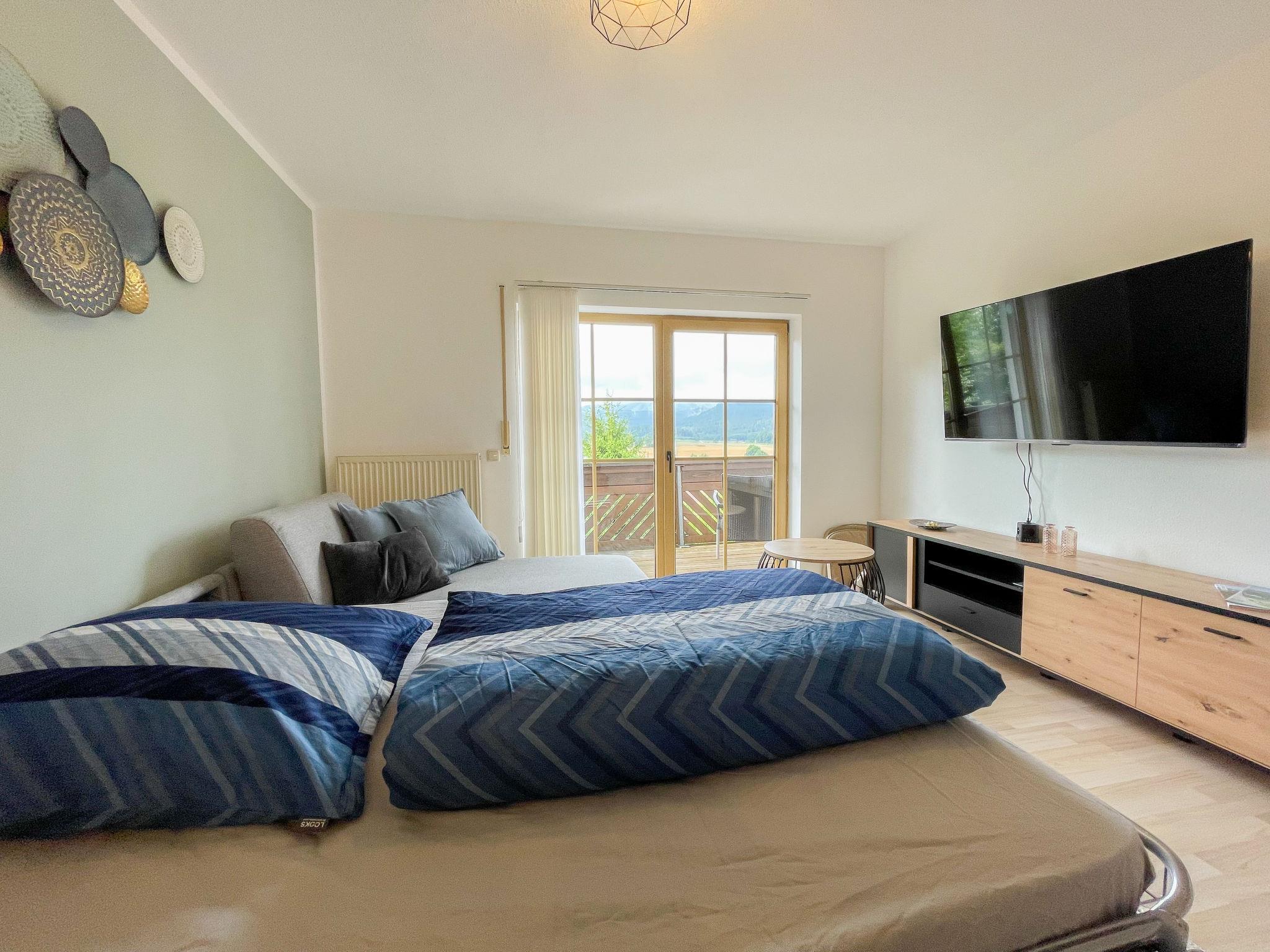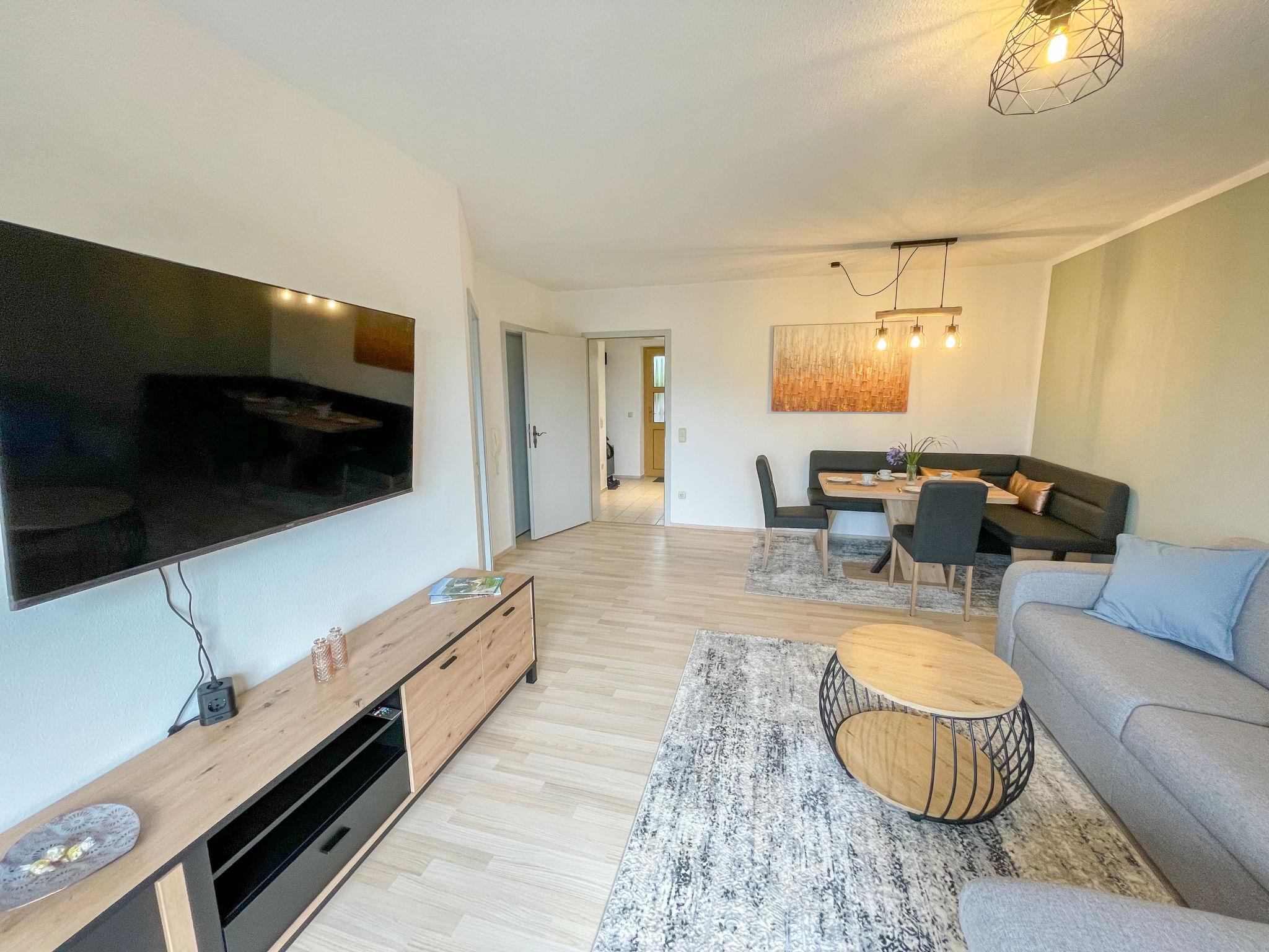 "ReMaWe", 2-room apartment 60 m2 on 1st floor. Object suitable for 2 adults + 3 children. Beautiful and cosy furnishings: living/sleeping room with 1 sofabed (140 cm, length 190 cm), dining nook and satellite TV (flat screen). Exit to the balcony. 1 room with 1 x 2 bunk beds, 1 double bed. Exit to the balcony. Kitchen (oven, dishwasher, 4 induction hot plates, toaster, kettle, electric coffee machine). Shower/WC. Heating. Balcony. Balcony furniture, box-room. Panoramic view of Geißkopf. Facilities: washing machine. Internet (WiFi, free). Garage (1 car). Please note: non-smokers only. Private entrance, smoke alarm.