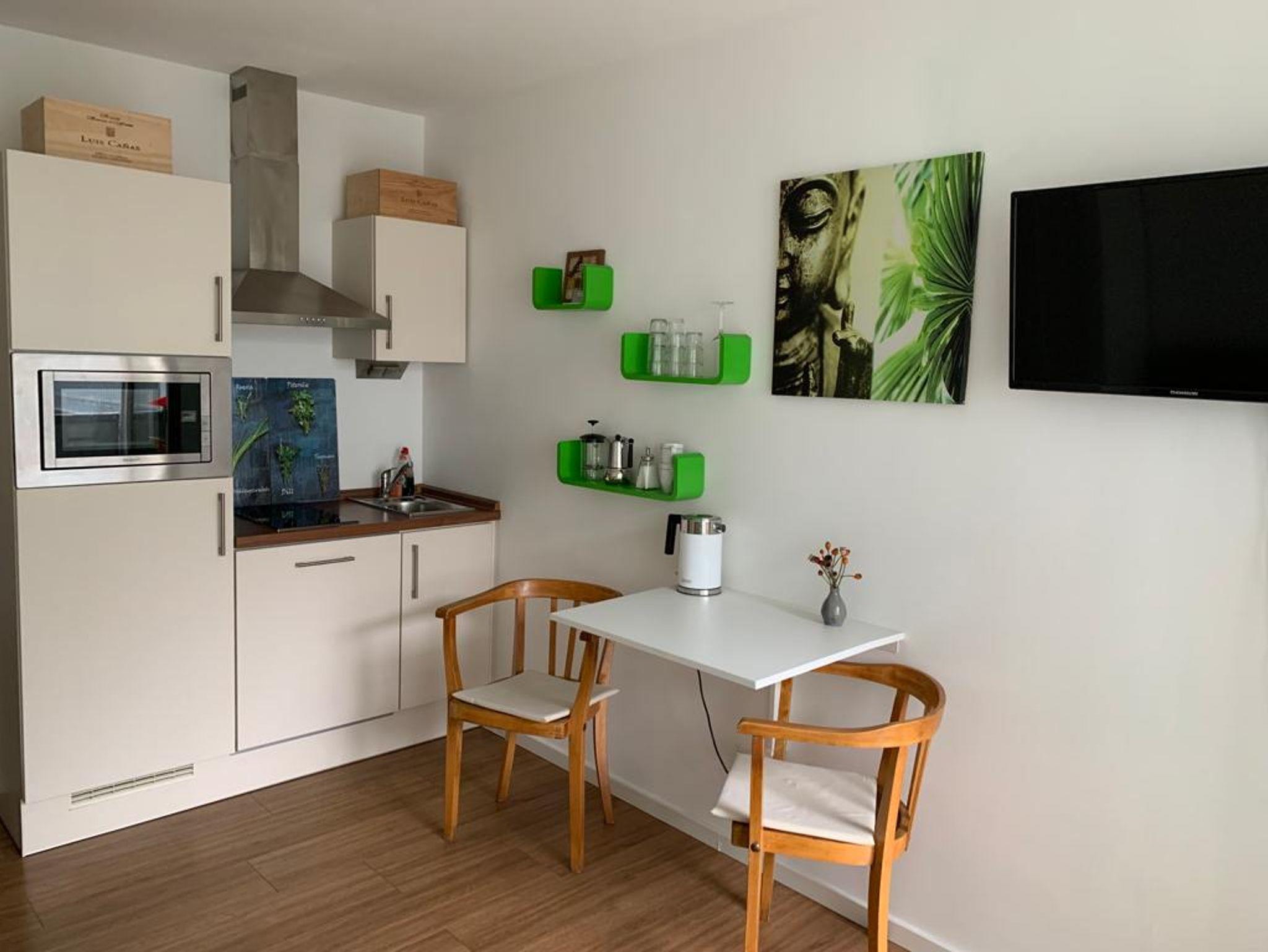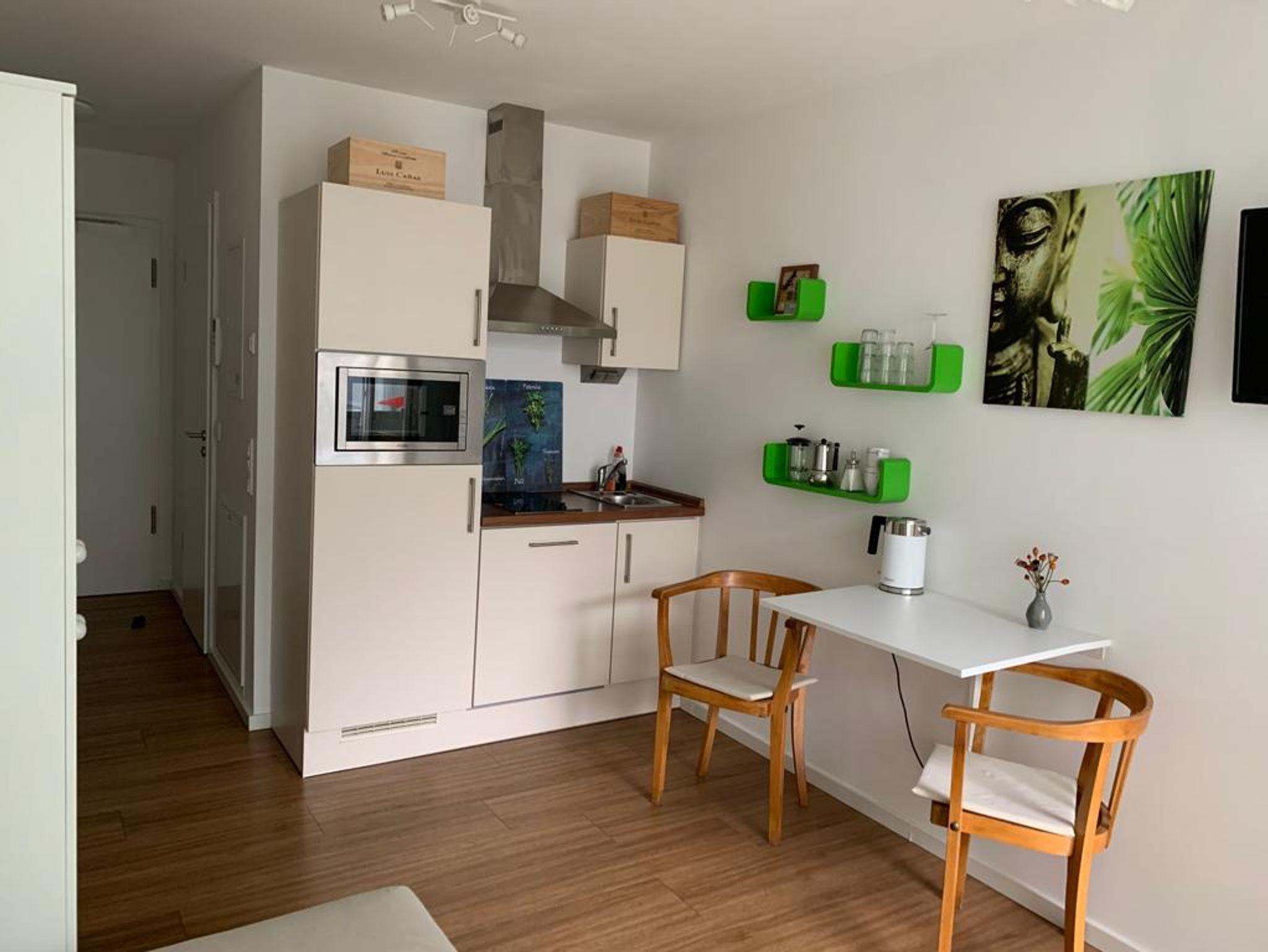 Schatzkästchen in Top Lage, alles da auf kleinstem Platz. Voll ausgestattetes Appartement (20 qm) mit Balkon zum ruhigen Innenhof. Das Appartement liegt im 3. Stock und ist bequem und barrierefrei über den Aufzug zu erreichen. Im kombiniertem Wohn- und Schlafbereich befinden sich Schlafmöbel, je nach Bedarf ein Einzelbett(90x200) mit Sitzgelegenheit , Schrank und Garderobe. Die Mini-Wohnküche verfügt über ein 2-Platten Cerankochfeld mit Dunstabzugshaube, Spüle, Kühlschrank mit Gefrierfach, Geschirrspülmaschine, Mikrowelle mit Grillfunktion sowie eine Mokka-Kaffeemaschine. Ein Esstisch für 2 Personen steht ebenfalls zur Verfügung. Das Bad ist ausgestattet mit Dusche, WC und Waschbecken. Die gesamte Wohnung verfügt über eine Fußbodenheizung.