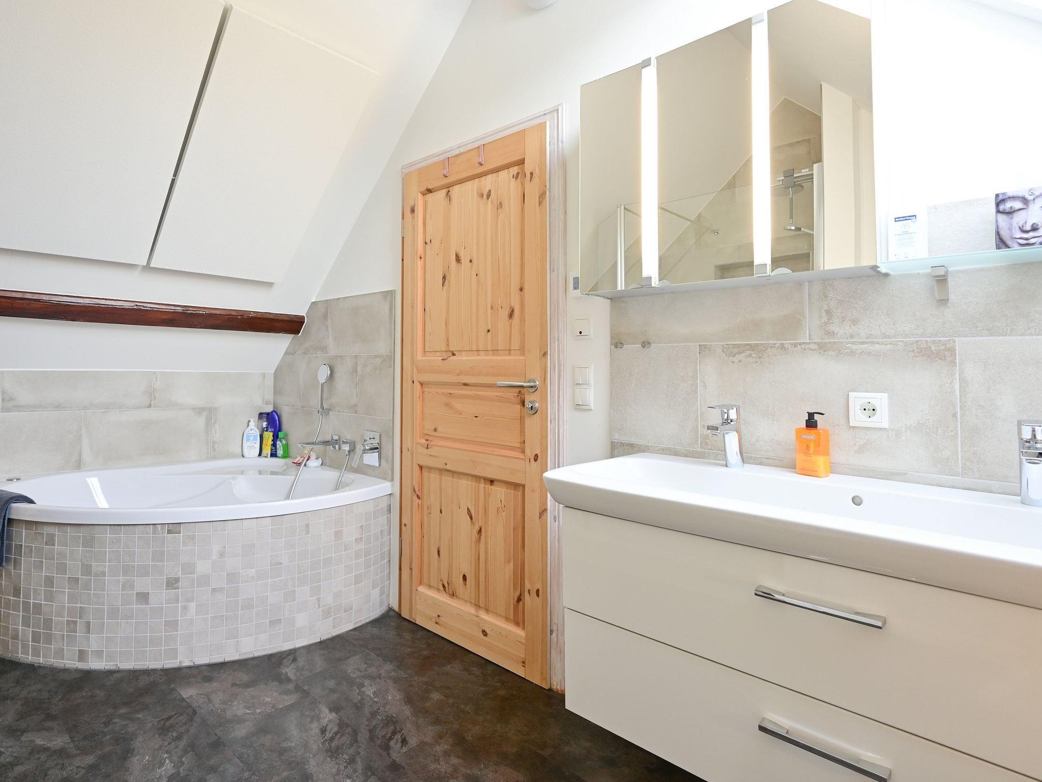 Im Dachgeschoss stehen Ihnen ein geräumiges Schlafzimmer mit Doppelbett 1,60m sowie ein Badezimmer mit Badewanne, Dusche, Doppelwaschbecken und WC zur Verfügung. Für zusätzlichen Komfort sind eine Waschmaschine und ein Wäschetrockner vorhanden. WLAN und ein Smart TV (Streamingdienste möglich) gehören ebenfalls zur Ausstattung.