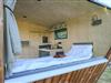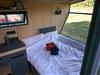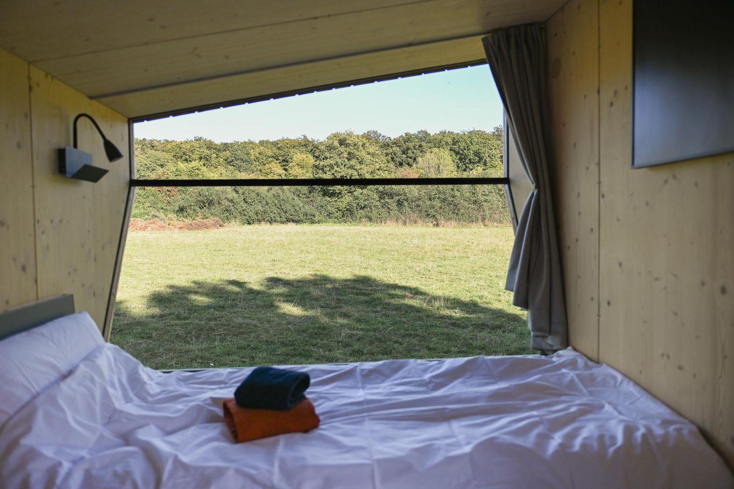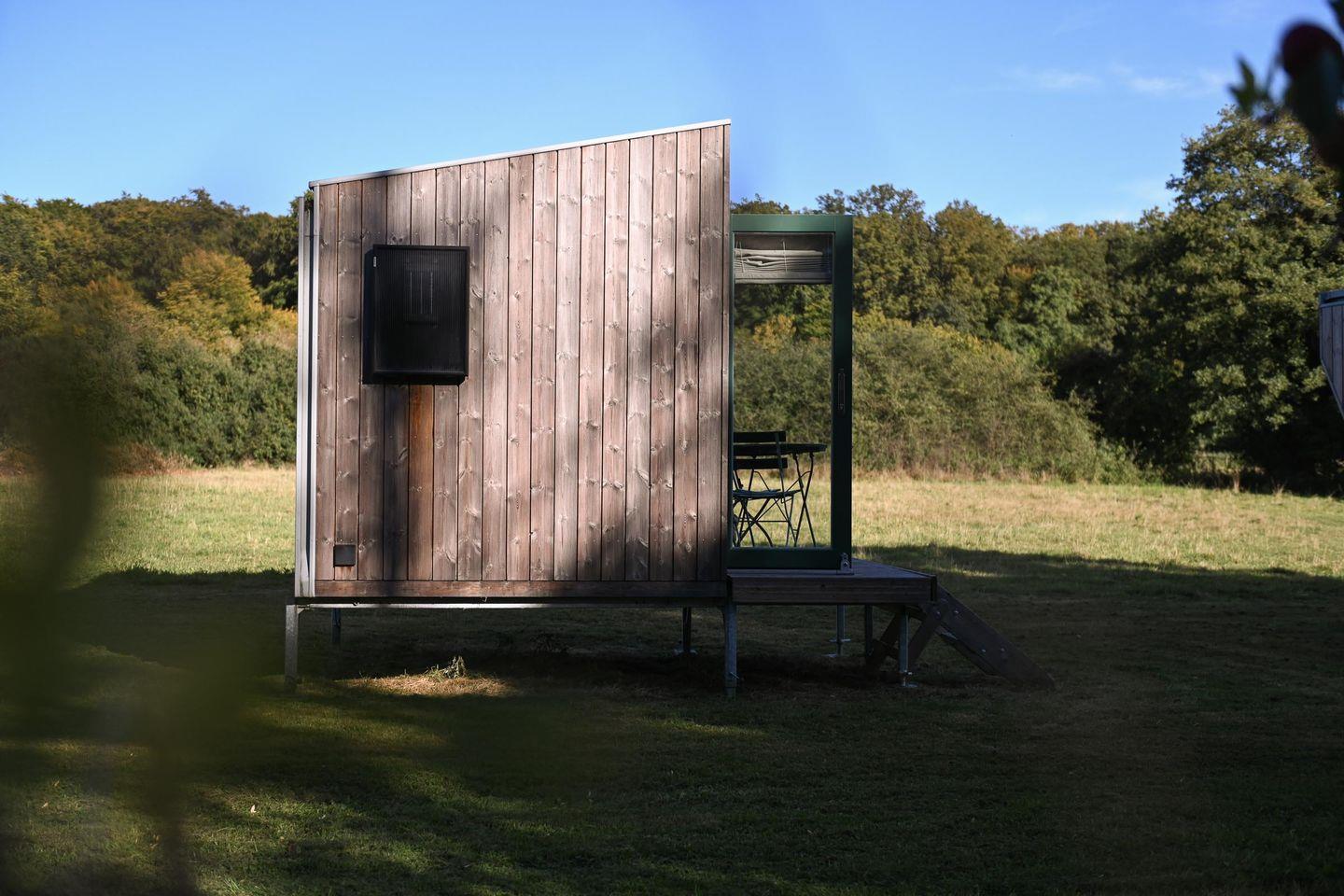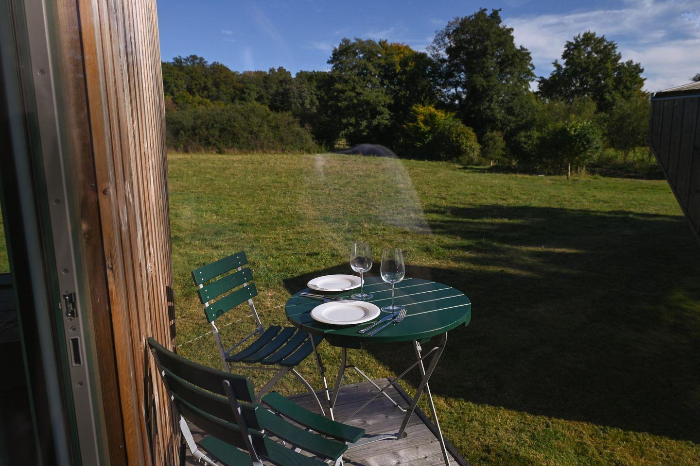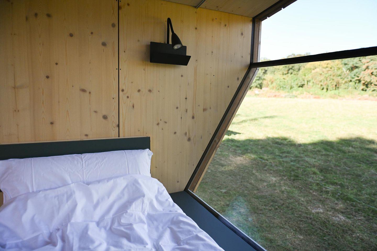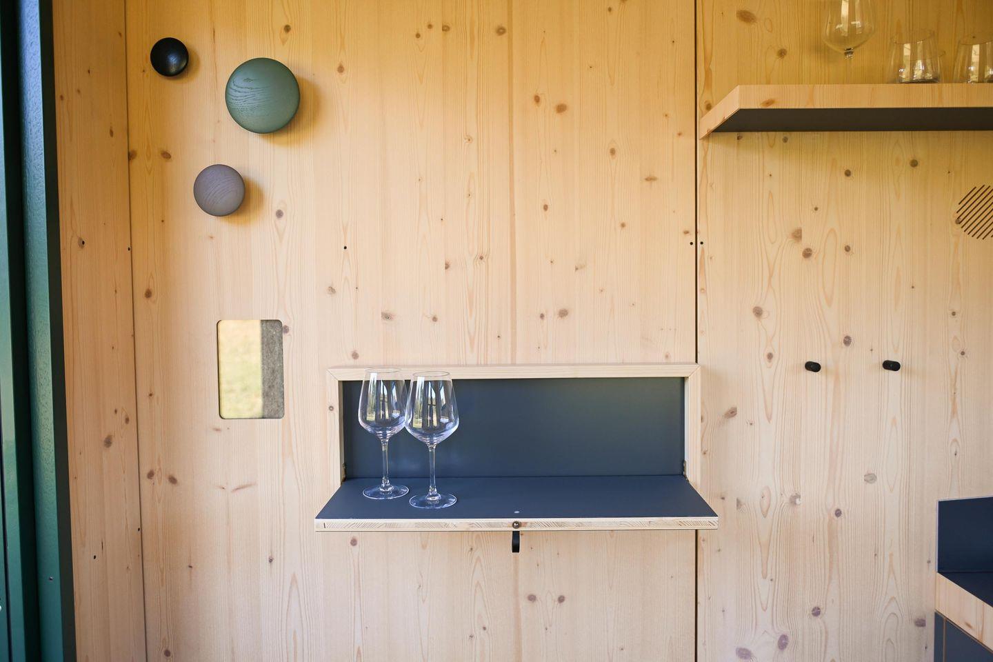 Draußen gibt es eine Mini-Terrasse mit Tisch und zwei Stühlen – perfekt für das Frühstück in der Morgensonne oder den Abend bei Naturgeräuschen. Eine ausklappbare Loungefläche im Inneren lädt tagsüber zum Lesen, Podcast hören oder einfach Liegen und Natur beobachten ein, abends wird daraus ein Schlafplatz.