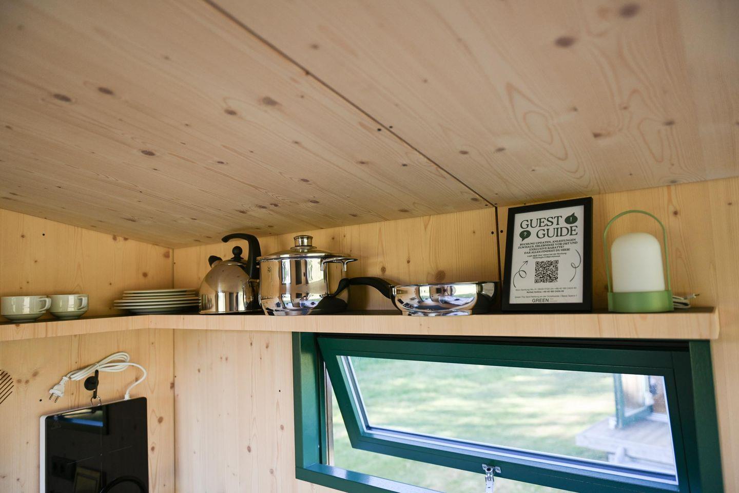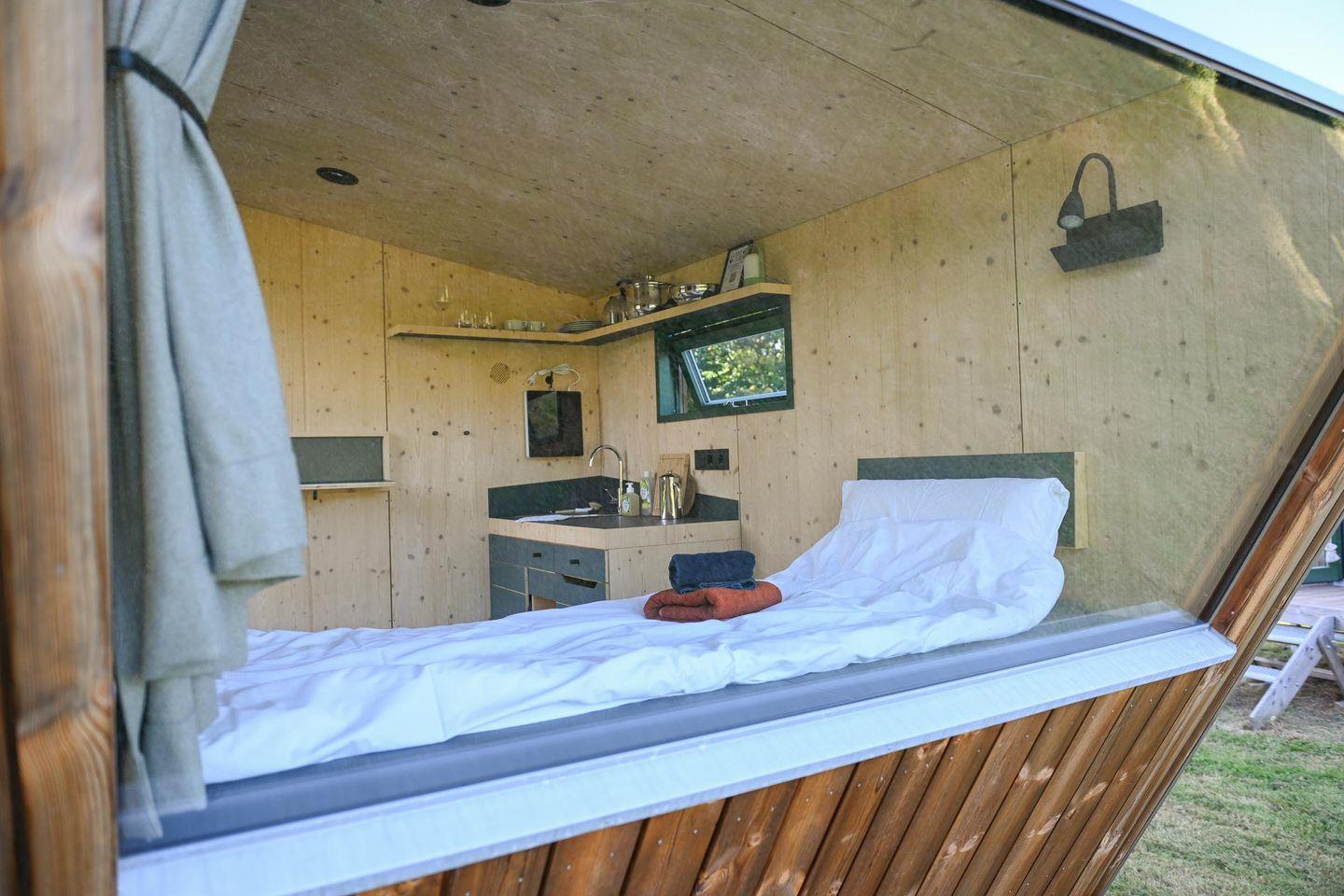 Auf 5 m² Innenfläche findest du alles, was nötig ist für einen Aufenthalt zu zweit: ein gemütliches Bett (1,40 × 2,00 m) inklusive Decken, Kopfkissen und hochwertiger Bettwäsche, genügend Stauraum, eine Heizung und ein großes Panoramafenster mit Verdunklungsmöglichkeit, das dir einen wunderbaren Blick über die Weide schenkt (je nach Saison mit Schafen). Für das leibliche Wohl sorgt eine kleine, aber gut ausgestattete Kochnische: Mini-Kühlschrank, ein mobiles Induktionskochfeld, Flötenkessel, French Press, Geschirr, Pfanne, Topf und Kochutensilien sowie Reinigungsmittel – alles da, um einfache Mahlzeiten und Kaffee ganz entspannt zuzubereiten.