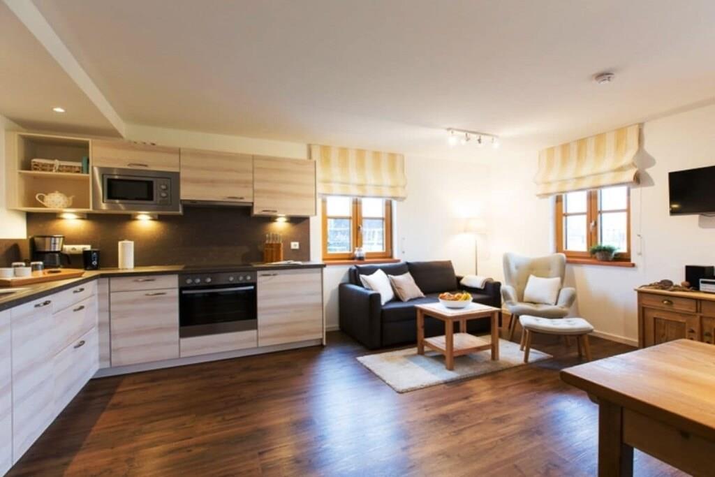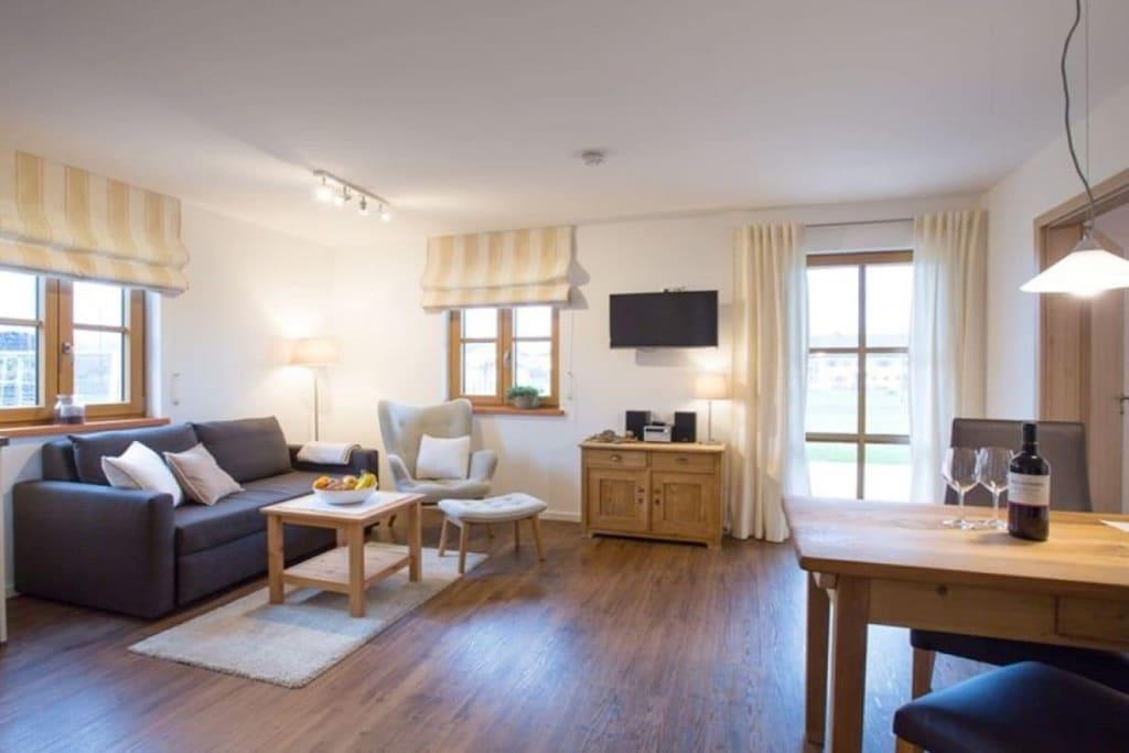 Ab Juli 2016! Auf 55m² Wohnfläche ist alles komplett neu gebaut und im modernen Landhausstiel eingerichtet. Die Wohnung besteht aus einem Schlafzimmer für 2 Personen ( Babybett auf Anfrage), einer geräumigen Wohnküche mit Südterrasse von der aus Sie einen wundervollen Blick in die bayerische Voralpenlandschaft haben. Ein großes Bad mit ebenerdiger Dusche ist selbstverständlich auch vorhanden. Ein Nebenraum für das unterbringen von Rädern, Skiern usw. ist ebenfalls vorhanden. Der Parkplatz befindet sich direkt neben dem Ferienhaus. Für Bauernhofliebhaber ist diese Wohnung ebenfalls zu empfehlen da sie sich direkt neben unserem Hof befindet. Ein großer Garten lädt zum spielen und verweilen ein. Grill wird gestellt