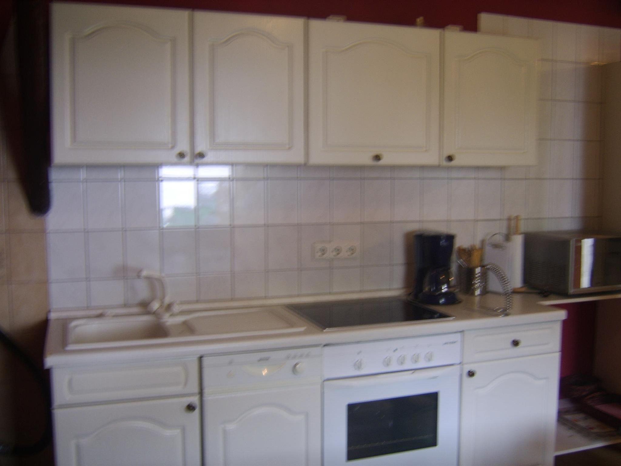 • komplett eingerichteter Küchenzeile mit Ceran-Kochfeld, Backofen, Mikrowelle, Kühlschrank, Spülmaschine, Kaffeemaschine und weiteren Küchenutensilien