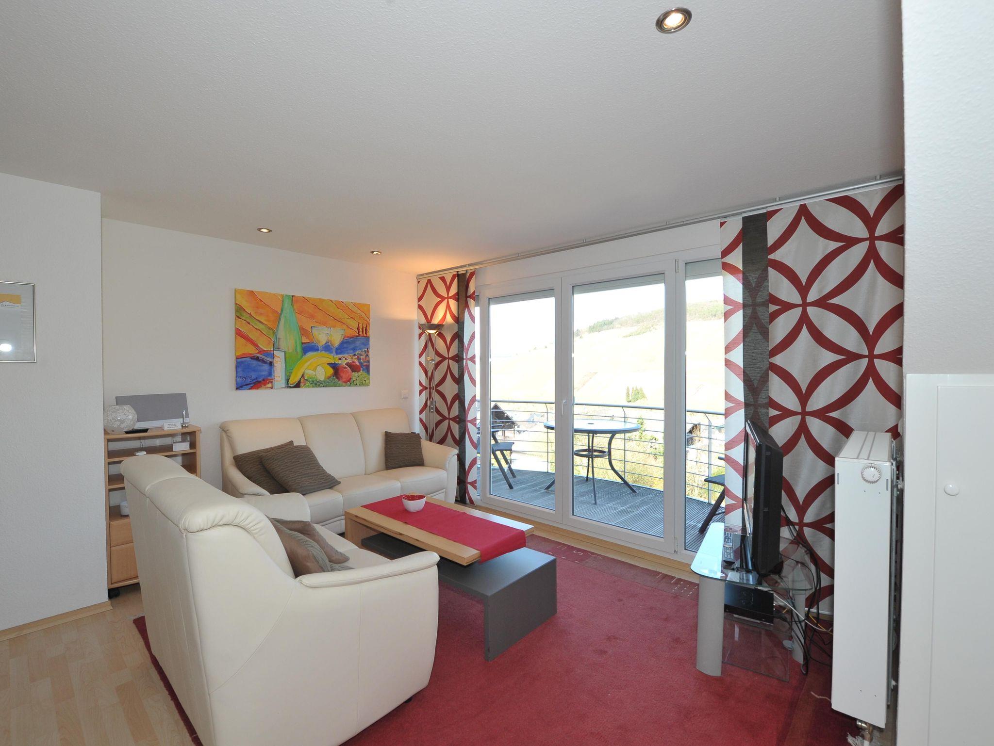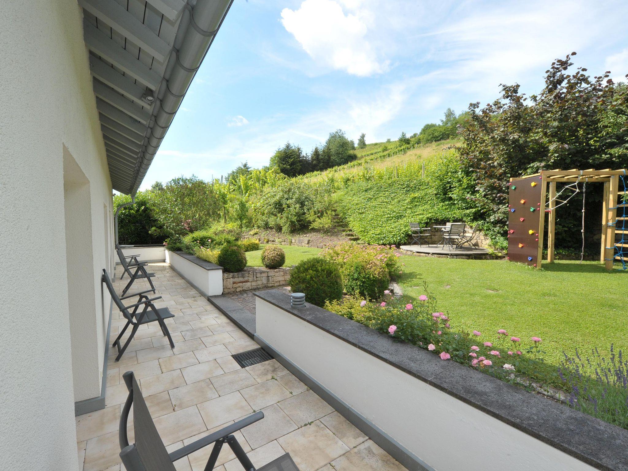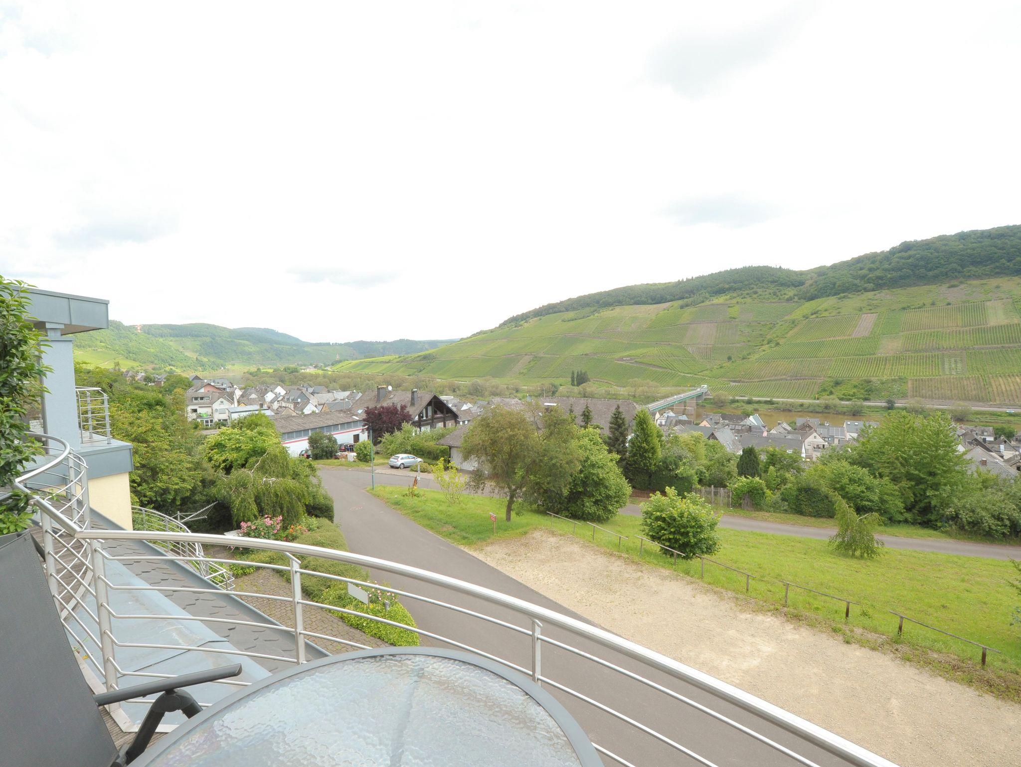 Die Wohnung verfügt über zwei eigene Terrasse mit spektakulärem Panoramablick ins Moseltal. Mit Hilfe einer Markise kann man auch bei Sonnenschein im Schatten auf der Terrasse sitzen. Im Garten stehen Gartenmöbel und Liegen bereit zur Nutzung. Eigene, kostenfreie Parkplätze sind direkt am Haus. Es handelt sich um eine Nichtraucherwohnung. Auf den Terrassen oder im Garten kann gerne geraucht werden. Haustiere sind nicht erlaubt. Hund auf Anfrage. Die Wohnung befindet sich im 2.Stock und ist über die Außentreppe mit 15 Stufen erreichbar. Im Flur steht ein Schrank mit Putzmitteln, Staubsauger, sowie Brettspielen, Spielkarten und Büchern bereit für unsere Gäste.