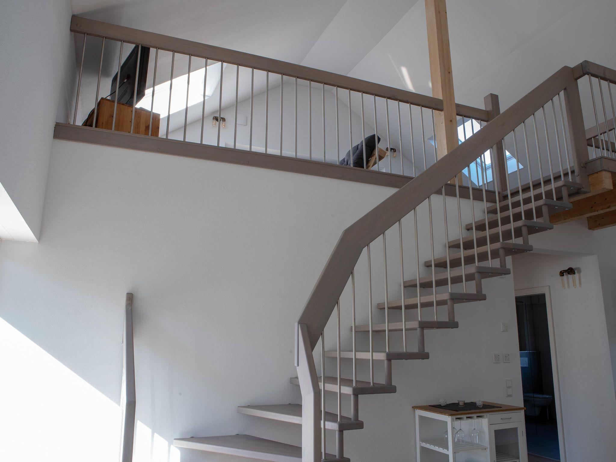 Wohnzimmer in der oberen Etage, großzügiges Esszimmer mit offener Küche, Badezimmer mit ebenerdiger Dusche, Schlafzimmer, Abstellraum und Balkon.
