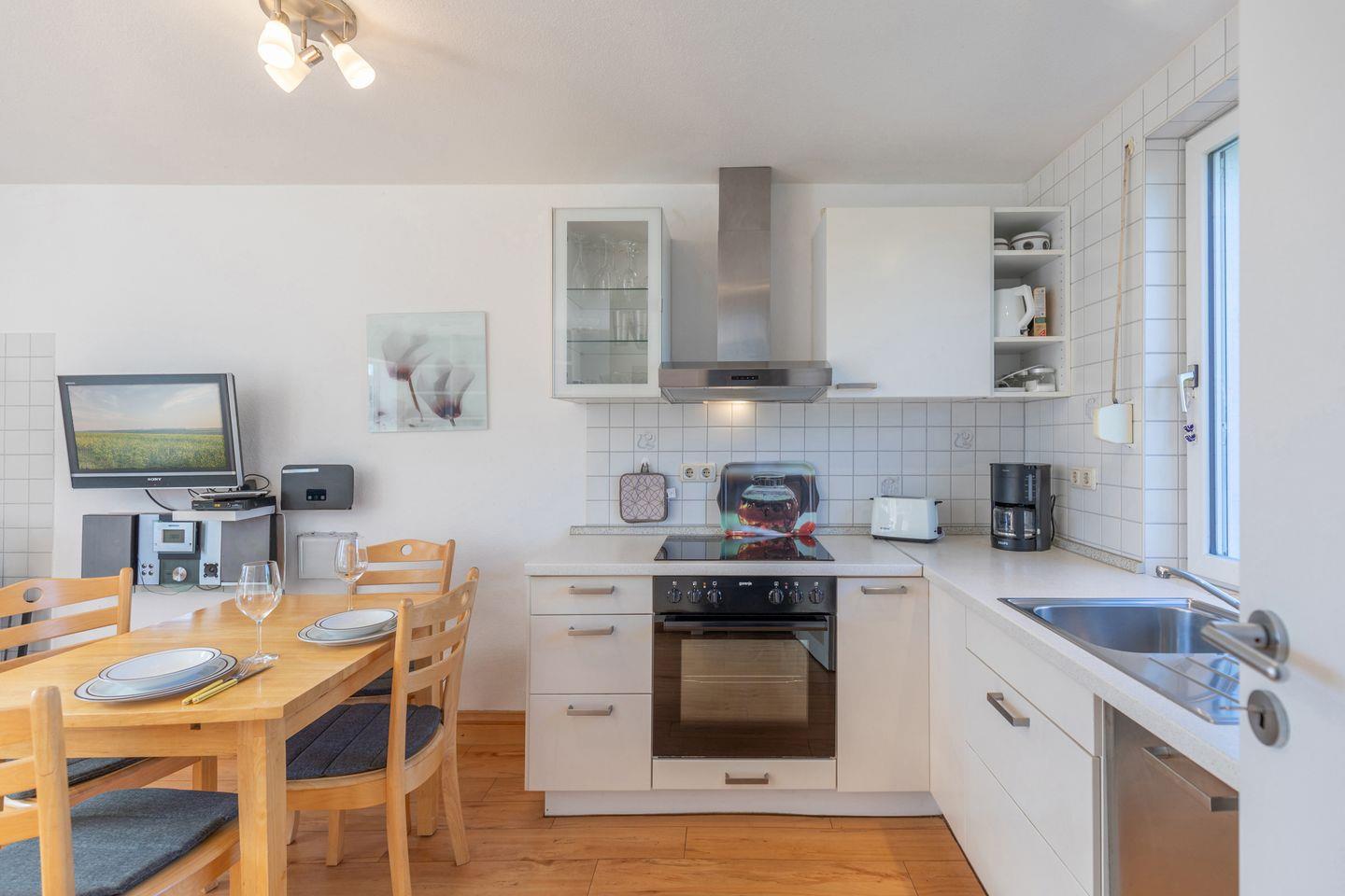 Das Ferienhaus bietet Ihnen auf 39 qm Wohnfläche einen offenen Wohnbereich mit zwei Fernsehsesseln, Kaminofen, TV und Musikanlage. Die offene Küche bietet Ihnen viele Annehmlichkeiten wie Geschirrspülmaschine, Herd, Backofen, Kühlschrank mit Gefrierfach.
