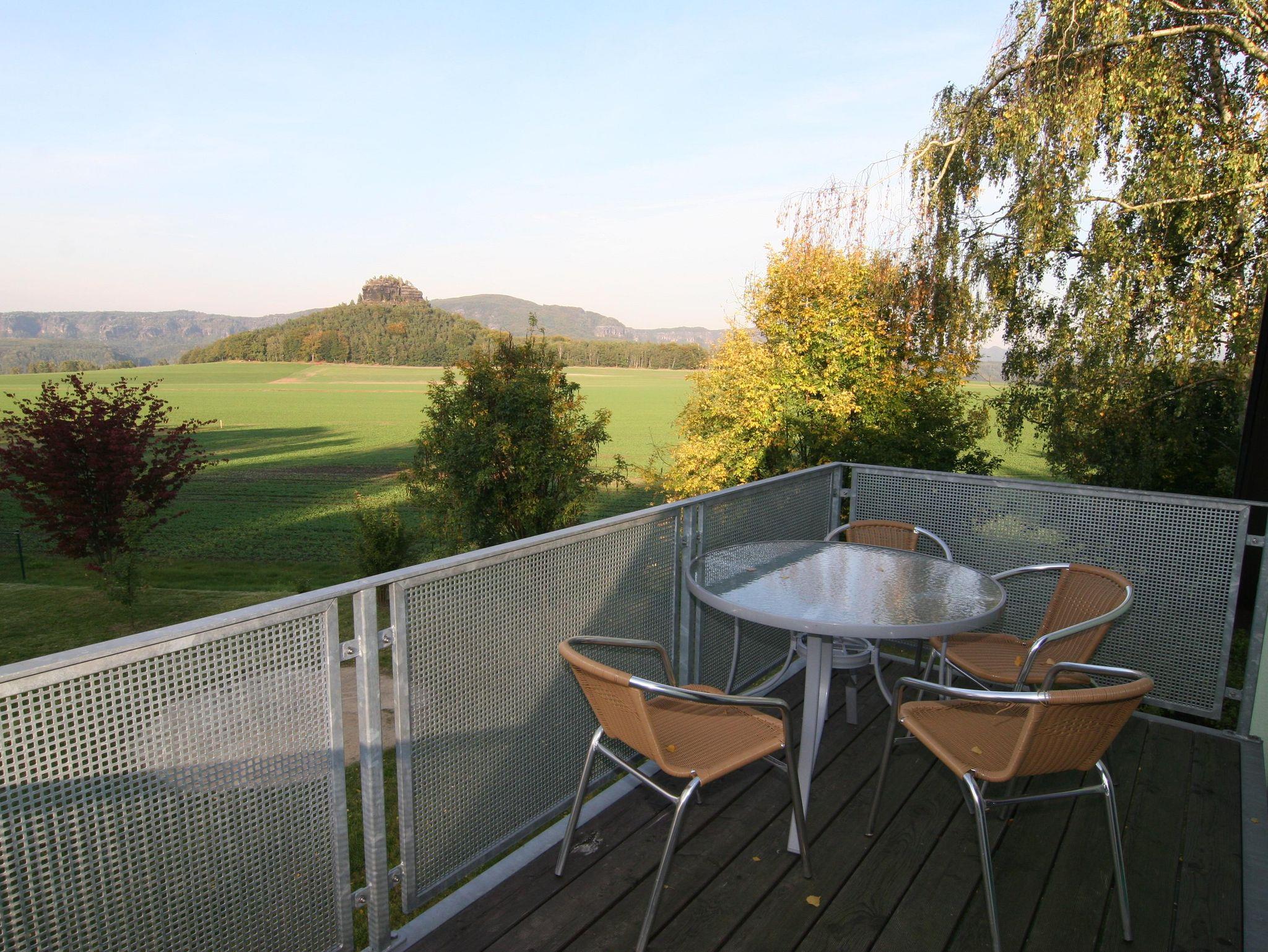 Die Ferienwohnung Häntzschelstiege befindet sich im Dachgeschoss und ist mit einer Wohnfläche von ca. 47 m² ideal für 2 bis 4 Personen geeignet. Das gemütliche eingerichtete Wohnzimmer verfügt neben einer separaten Essecke auch über eine Schlafcouch. Die Küche ist mit einem Kochfeld, Kühlschrank, Kaffeemaschine, Wasserkocher und Toaster ausgestattet. Dusche/WC finden Sie im Badezimmer. Von dem Balkon genießen Sie einen traumhaften Ausblick in die Sächsische Schweiz. Ein zusätzliches Kinderbett können wir Ihnen bei Bedarf bereitstellen.