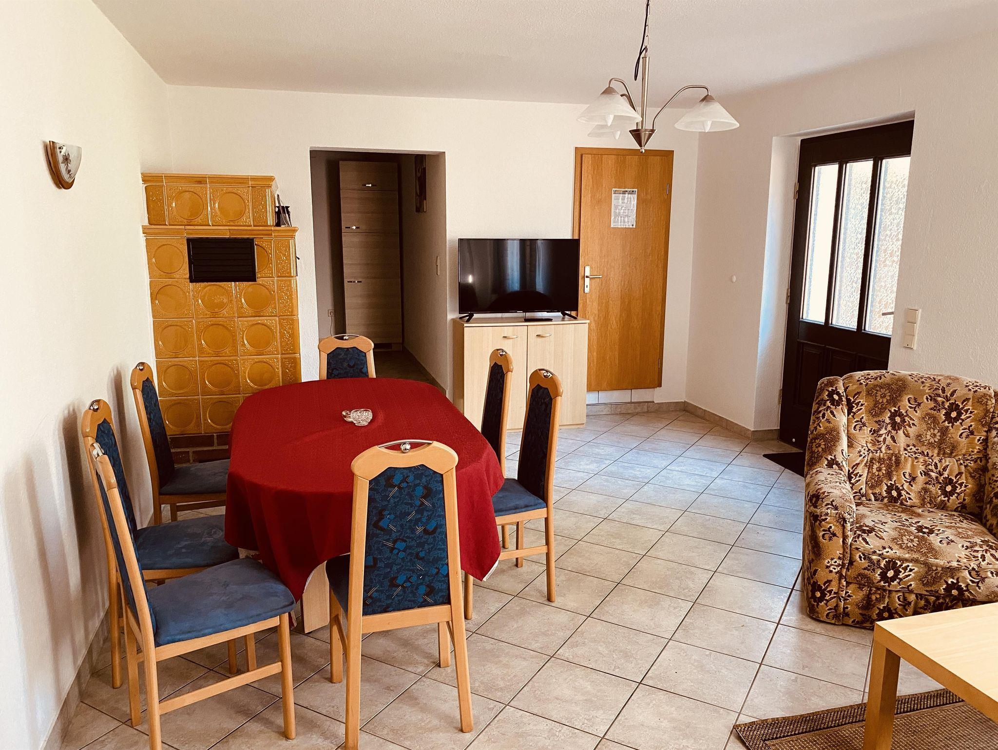 Die großzügig eingerichtete Ferienwohnung Flößersteig befindet sich im Erdgeschoss und bietet auf ca. 63 m² ausreichend Platz für 3-5 Personen. Das gemütliche Wohnzimmer verfügt über eine separate Essecke. Durch die zwei getrennten Schlafzimmer ist die Ferienwohnung auch wunderbar für mehrere Familien geeignet. Ein zusätzliches Kinderbett können wir Ihnen bei Bedarf bereitstellen. Die moderne Küche ist mit einem Backofen inkl. Ceranfeld, Kühlschrank, Kaffeemaschine, Wasserkocher und Toaster ausgestattet. Das Badezimmer verfügt über Dusche und WC. Zusätzlich können Sie die Terrasse mit Sitzmöglichkeiten nutzen.
