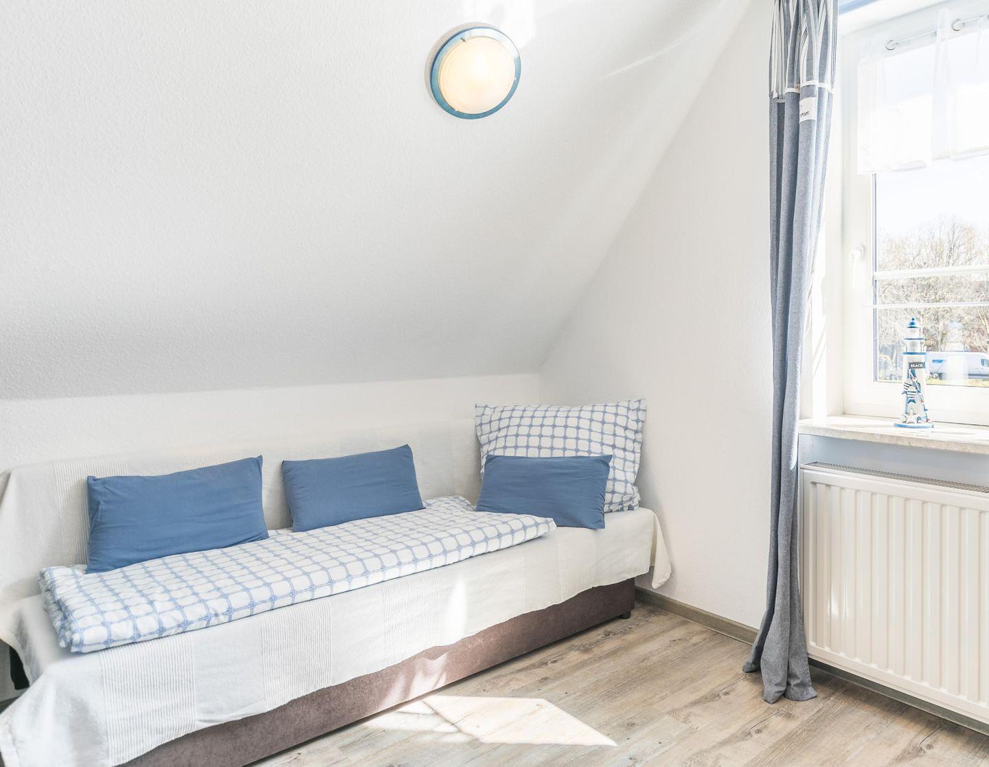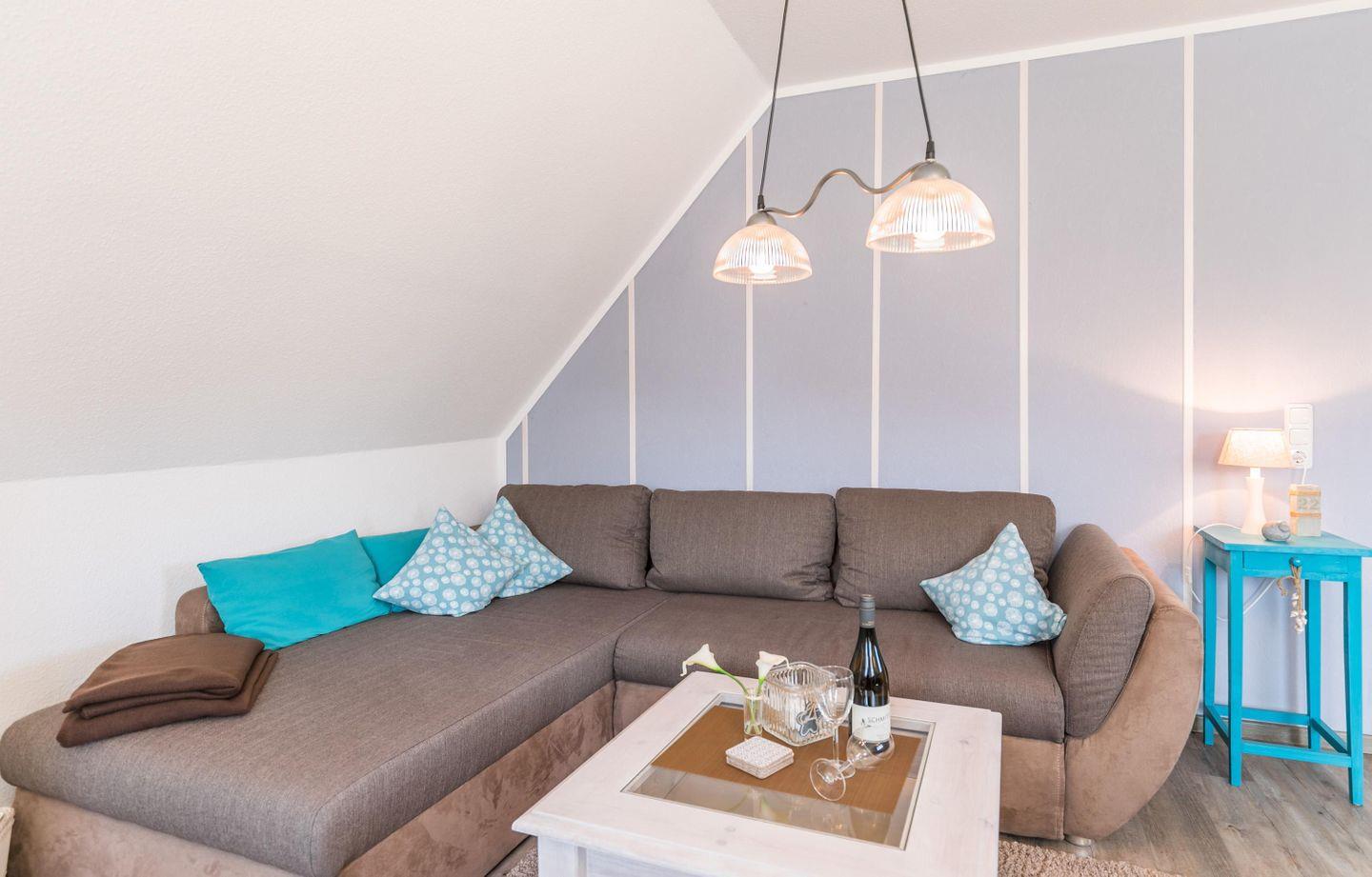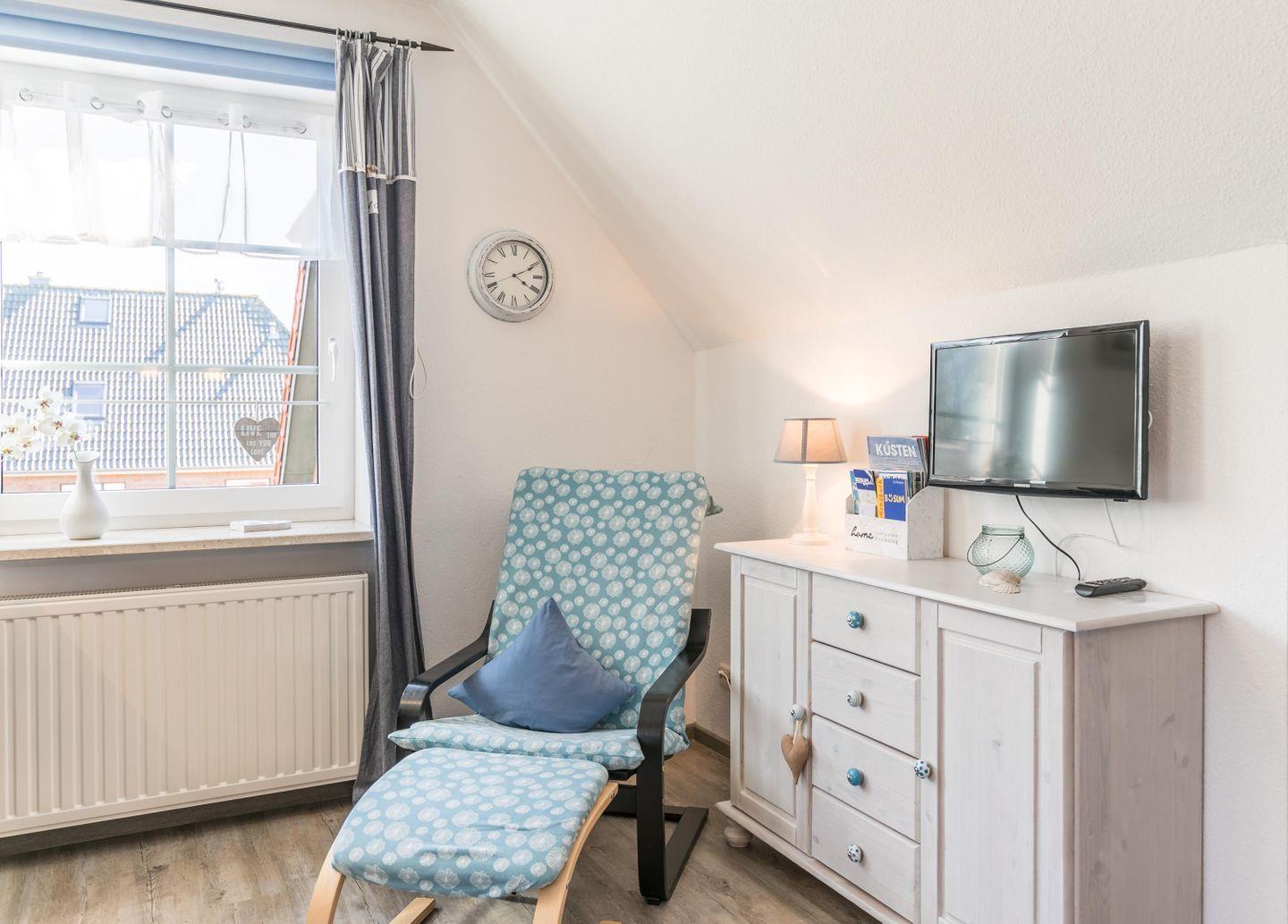 Die Wohnung liegt im 1. Obergeschoss, hat ein modernisiertes Schlafzimmer mit Doppelbett und zwei Schlafsofas im Wohnbereich. Eine maximale Belegung von 2 erwachsenen Personen und einem Kind ist daher möglich! Die Mitnahme eines weiteren Kindes auf Anfrage und gegen Aufpreis möglich.
