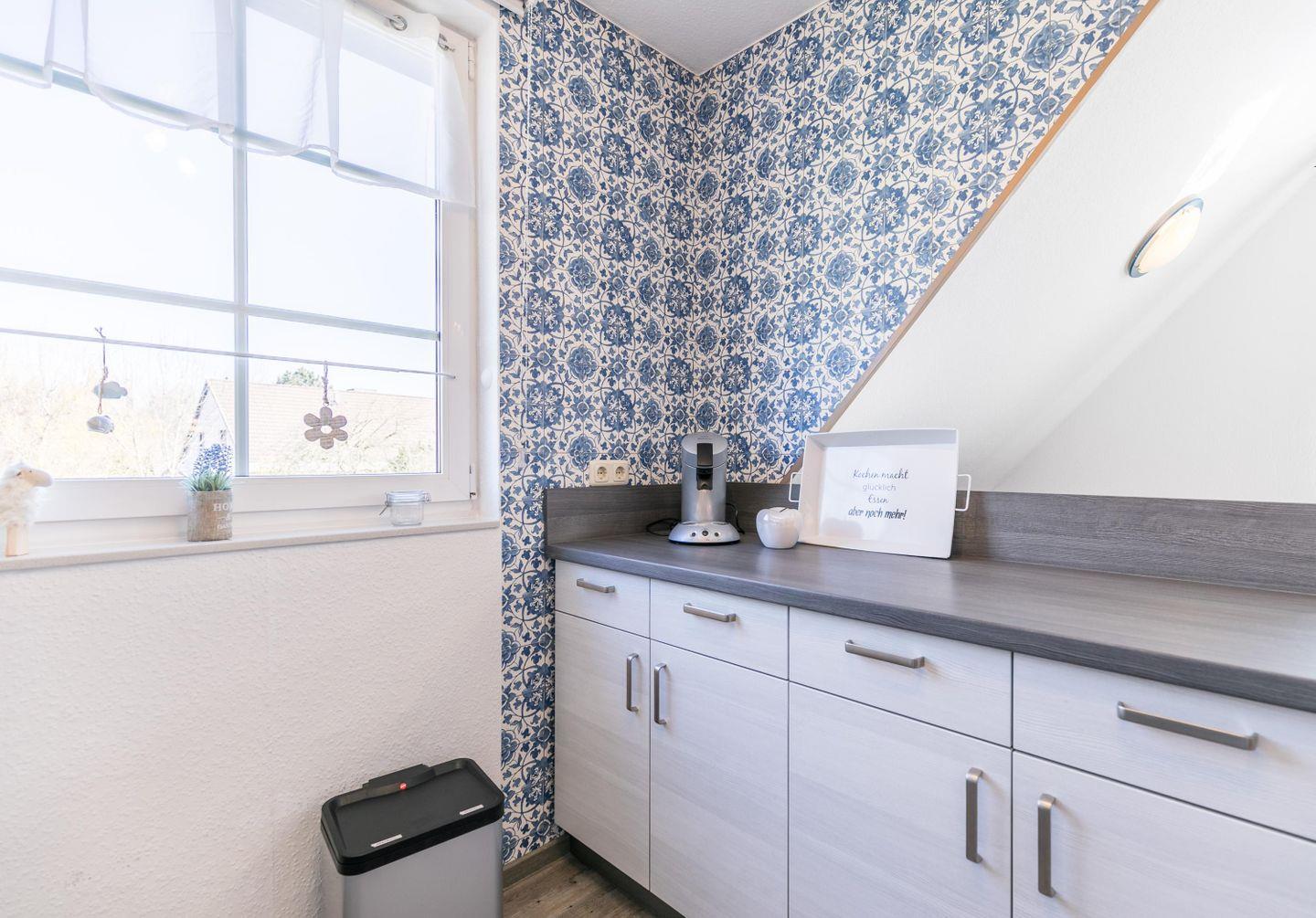 Cerankochfeld, Backofen, Kühlschrank mit kleinem Gefrierfach, Kaffeemaschine, Senseo-Padmaschine, Toaster, Wasserkocher, Eierkocher, Spülmaschine, Mikrowelle