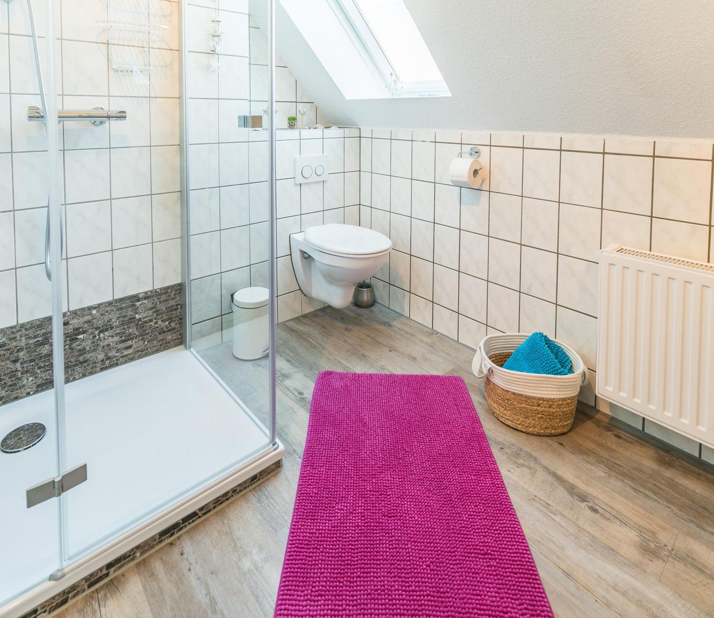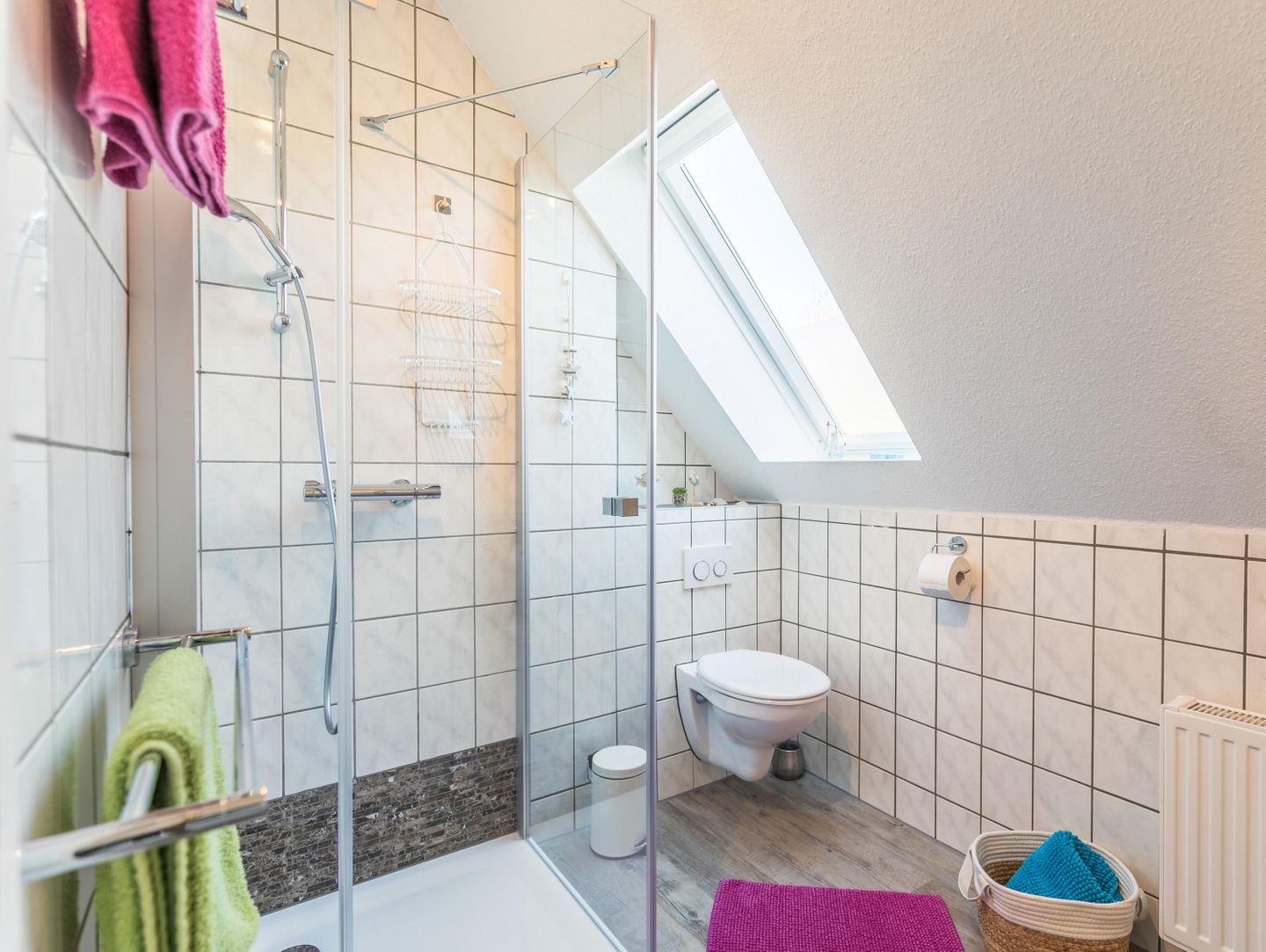 Duschbad, WC, Waschbecken, Spiegel, Föhn, Fenster