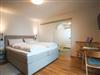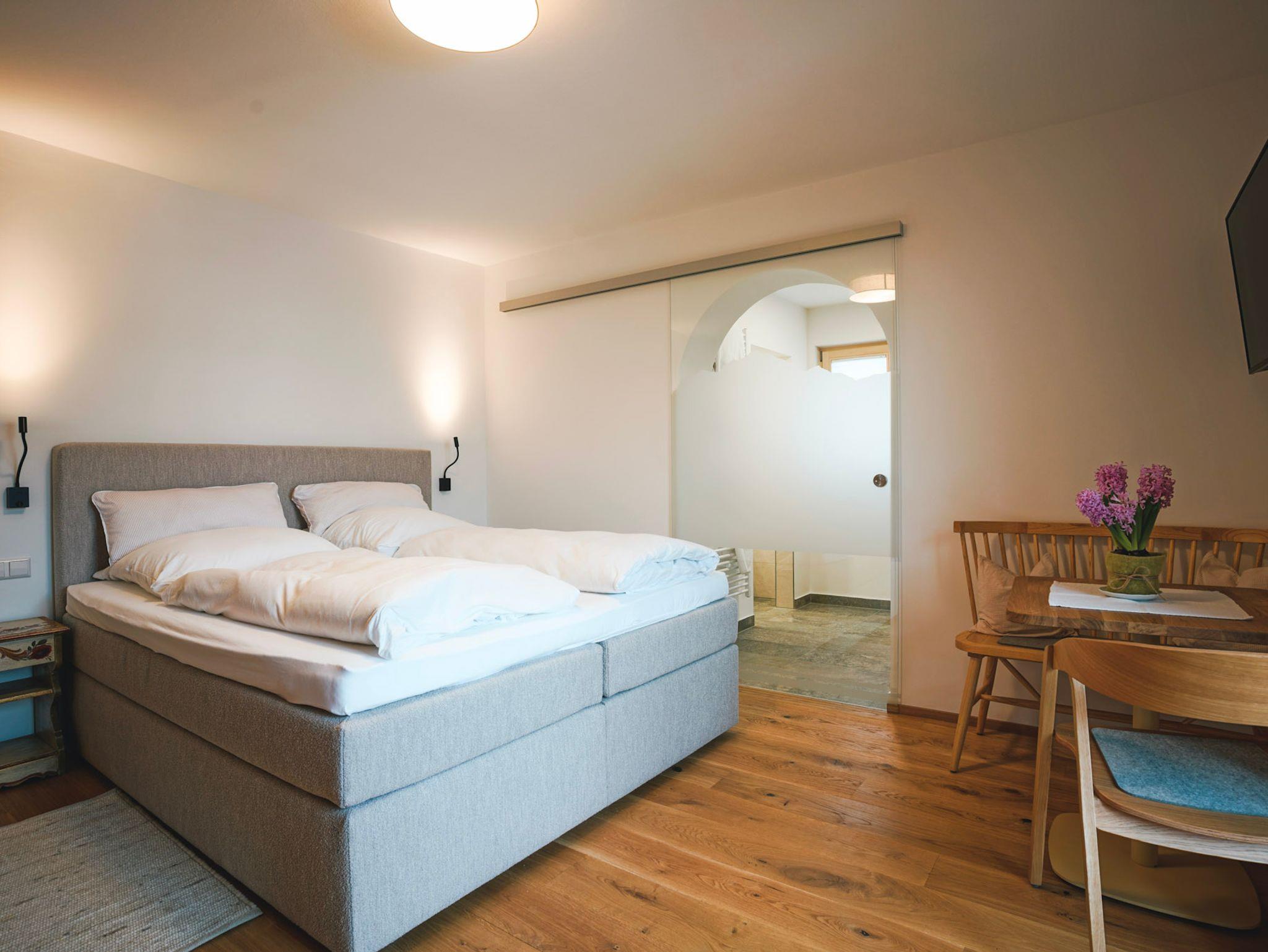 Das Doppelzimmer hat eine Grösse von ca. 25 qm, das separate Badezimmer ist durch eine Glasschiebetüre mit Sichtschutz getrennt.