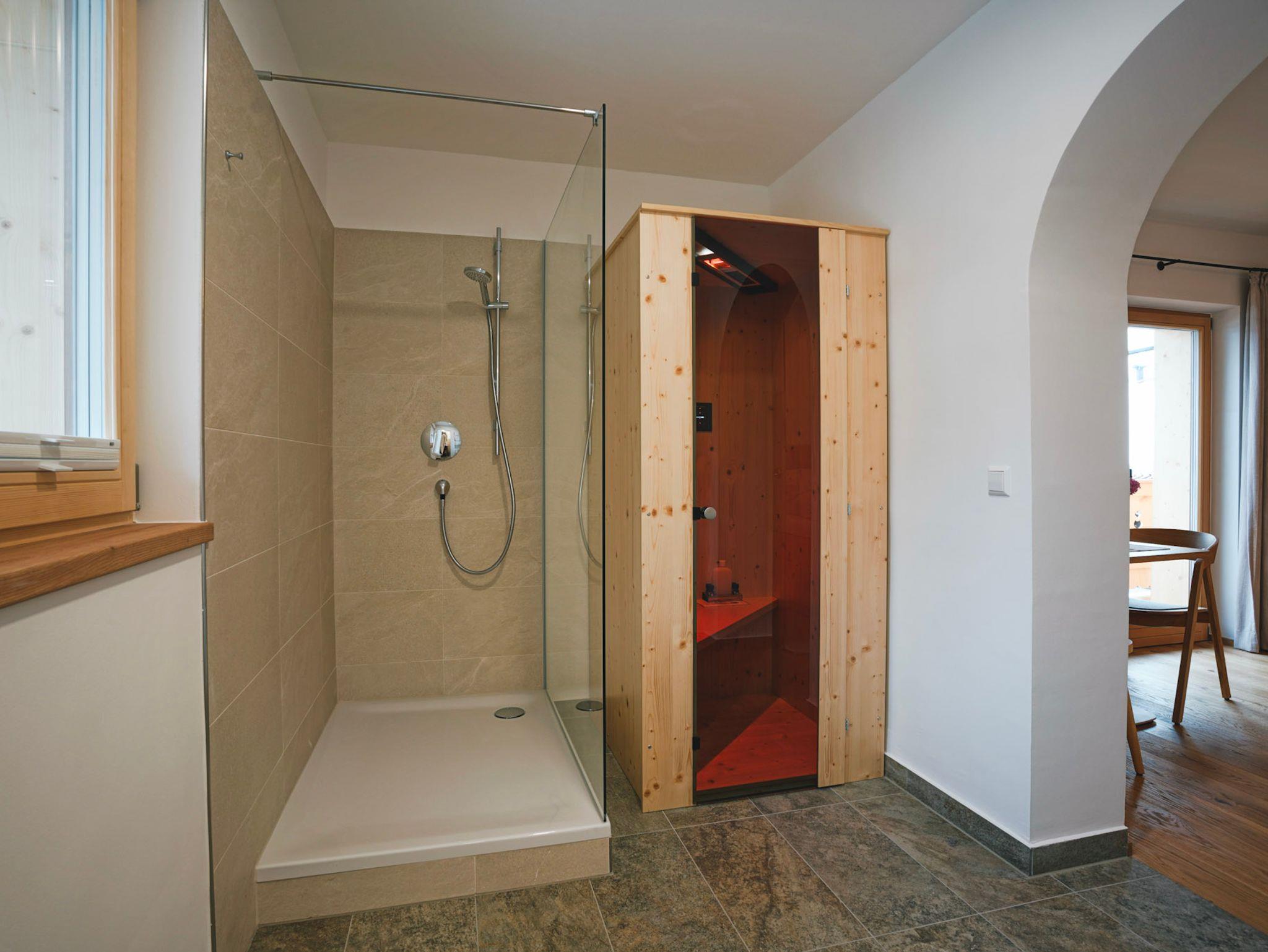 Im großen Badezimmer befindet sich eine Infrarotkabine der Fa. Physiotherm GmbH. Es steht Ihnen ein Kühlschrank sowie Geschirr und Besteck für kleine Brotzeiten zur Verfügung.