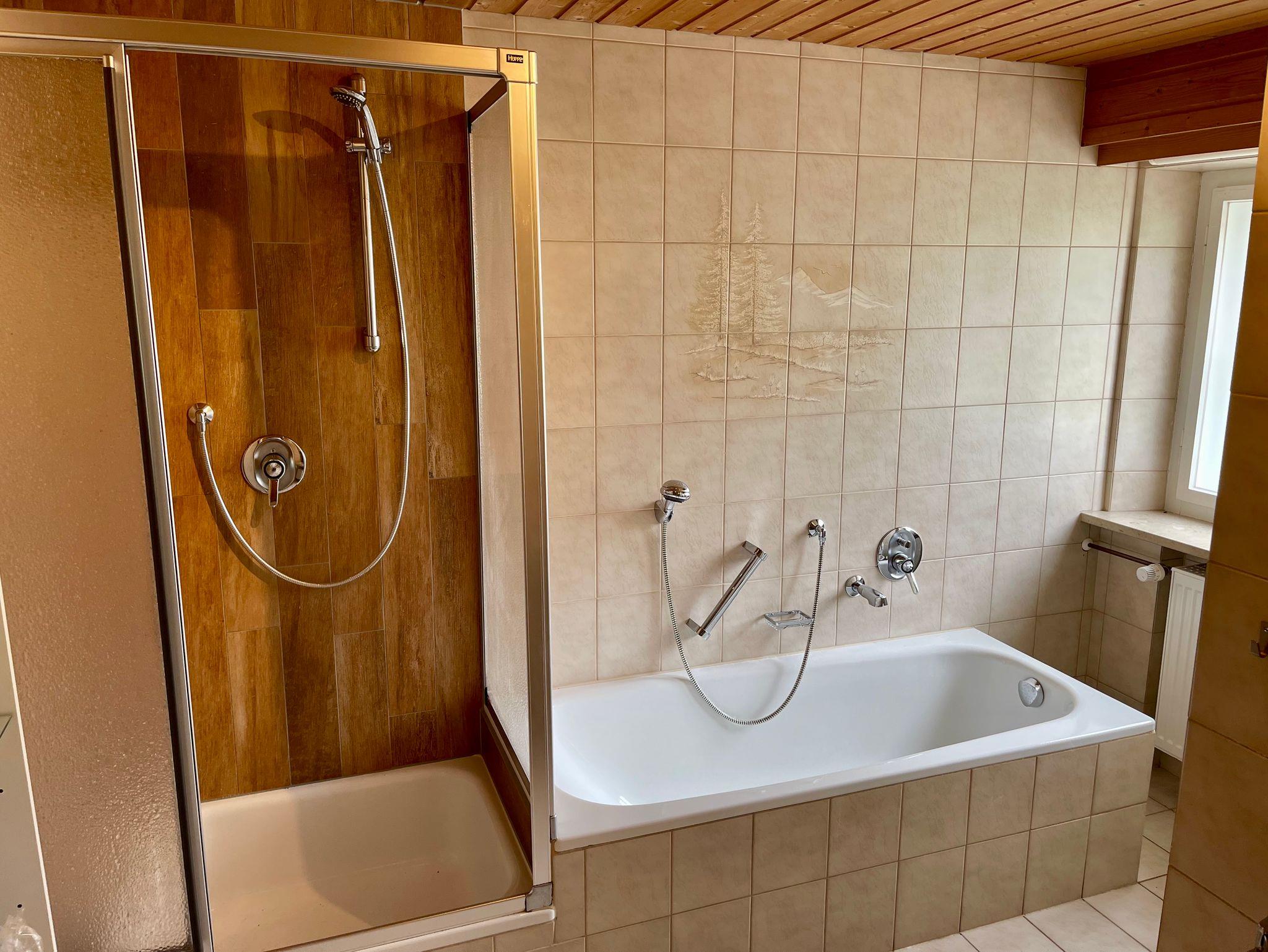 Flur, Bad mit Badewanne/Dusche und WC, großer Wohnküche mit Speis und Wohnzimmer. Die Privatparkplätze sind direkt vorm Haus.