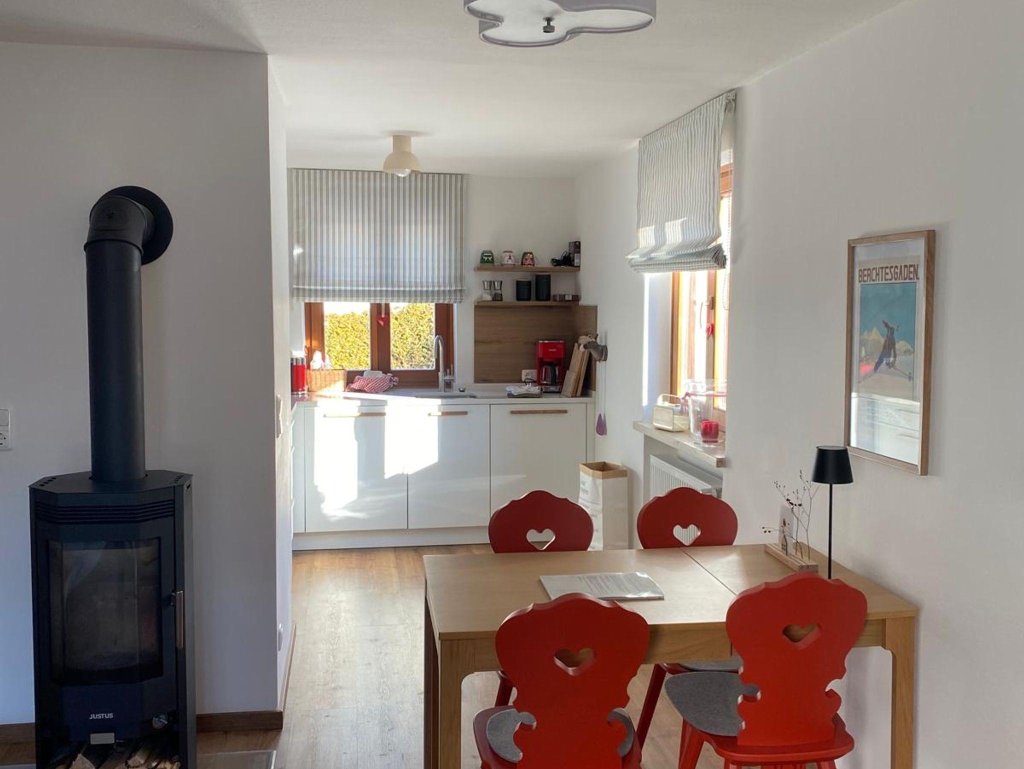Die Ferienwohnung erstreckt sich über zwei Etagen und großzügige 67 m². Sie wurde im Jahr 2023 komplett renoviert und liebevoll neu eingerichtet. Per kostenlosem WLAN haben Sie in der gesamtem Wohnung Internetzugang. Die Wohnung verfügt über einen separaten Hauseingang. Im Erdgeschoss gelangt man über den Eingangsbereich mit Garderobe und Ablagemöglichkeiten und separatem WC in das Wohn-Esszimmer mit großer Küche. Dieser Bereich ist ausgestattet mit einer bequemen Couch, Korbsessel, Couchtisch, Sideboard mit großem Smart-TV, einem ausziehbaren Esstisch mit Chiemseestühlen und einem hübschen Kaminofen. Hier lassen sich insbesondere im Winter gemütliche Stunden verbringen. Durch eine Doppelglastür gelangt man auf die großzügige Terrasse mit Gartenmöbeln ( Tisch, Stühle, Sonnenschirm und Grill) welche im Sommer zum Verweilen und Grillen einlädt.