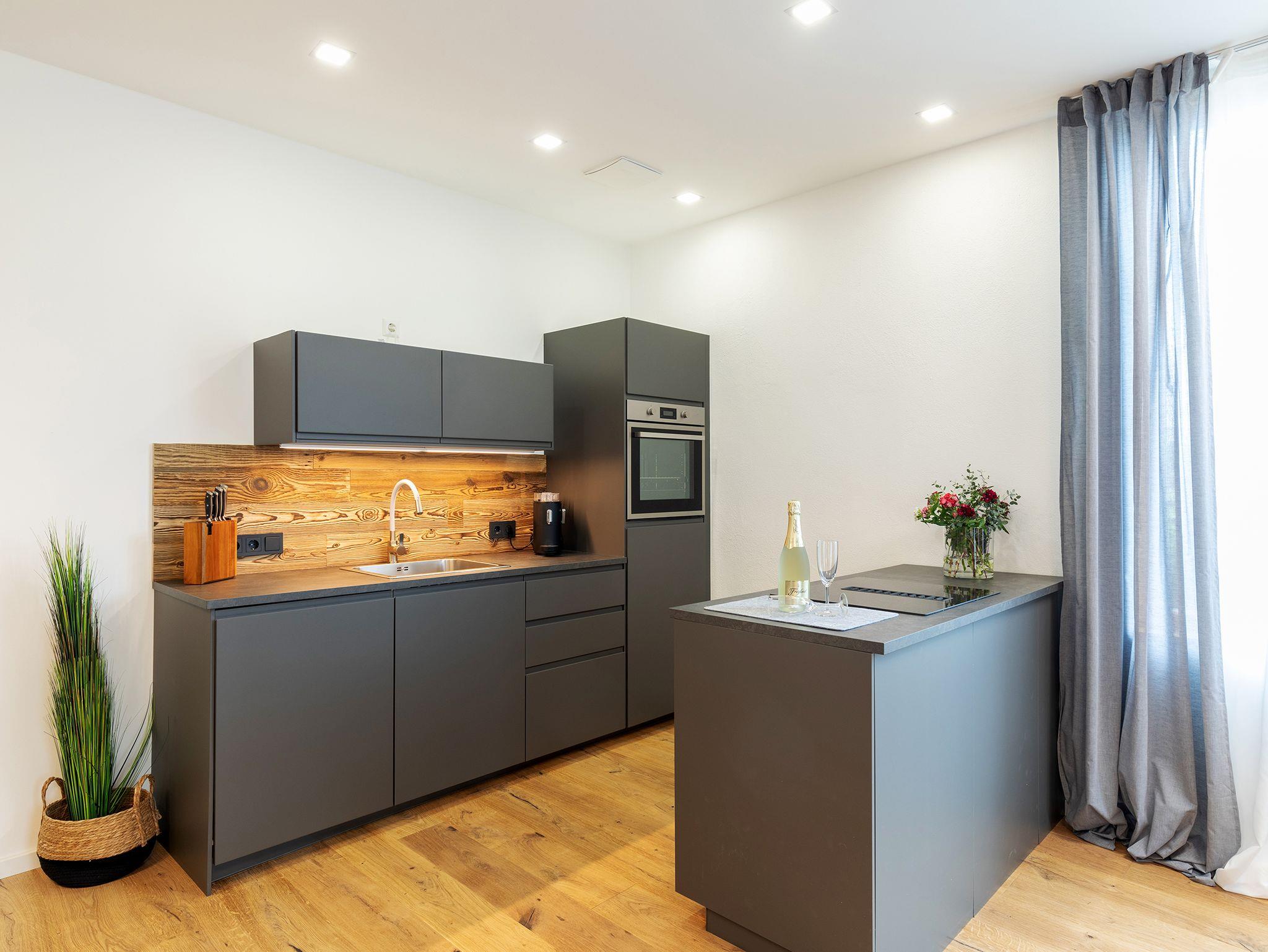 • Designküche mit Induktionskochfeld, separatem Backofen, Geschirrspüler, Mikrowelle, Kühlschrank mit Gefrierfach, Nespressomaschine, Toaster, Wasserkocher und vielem mehr