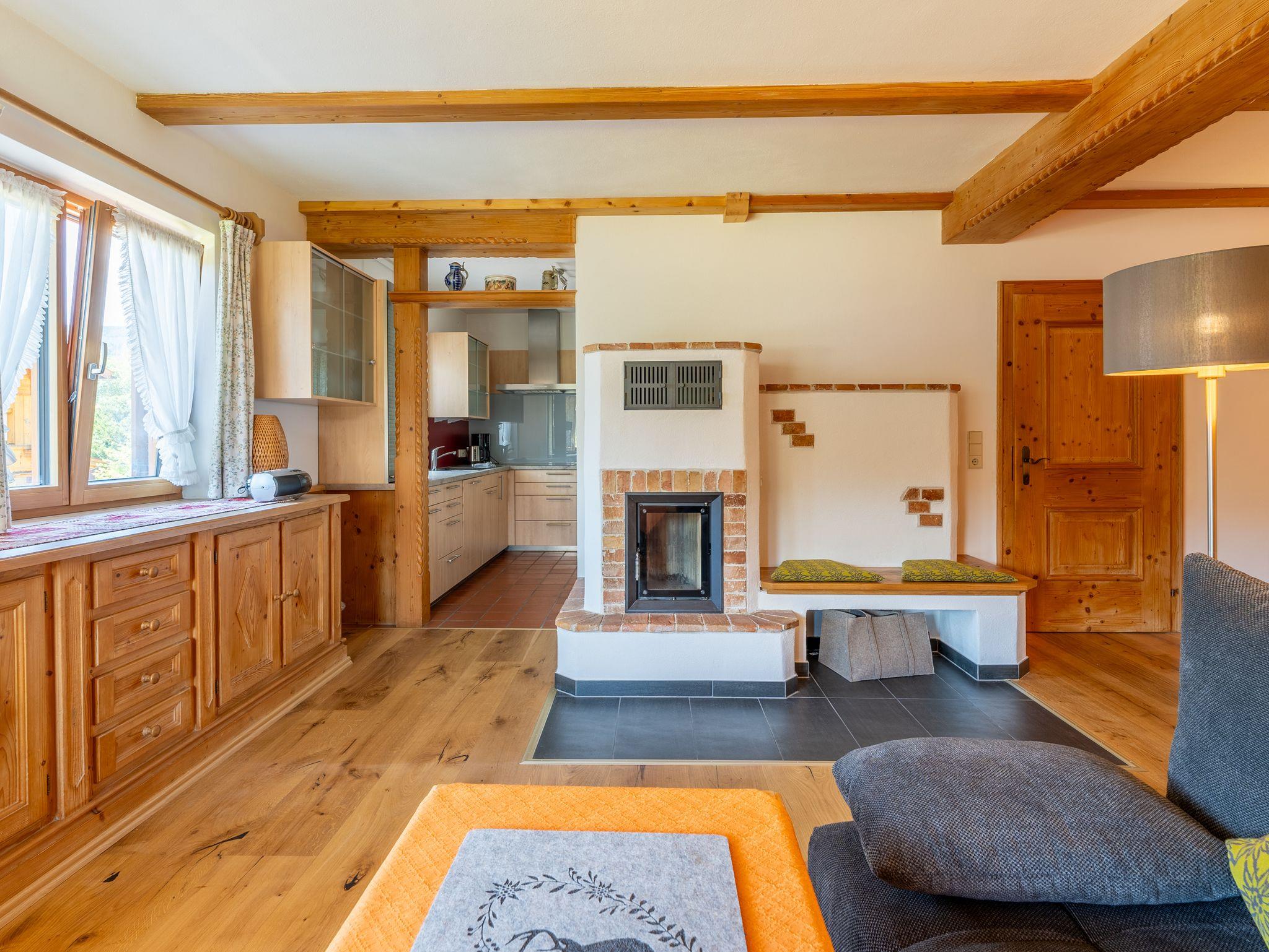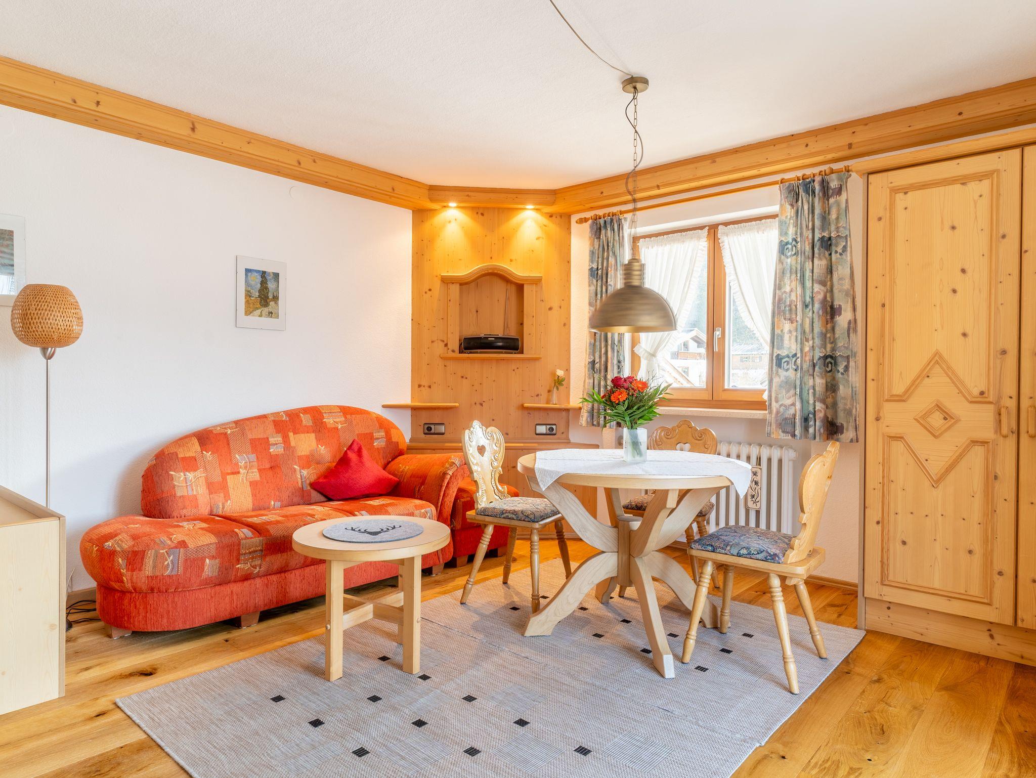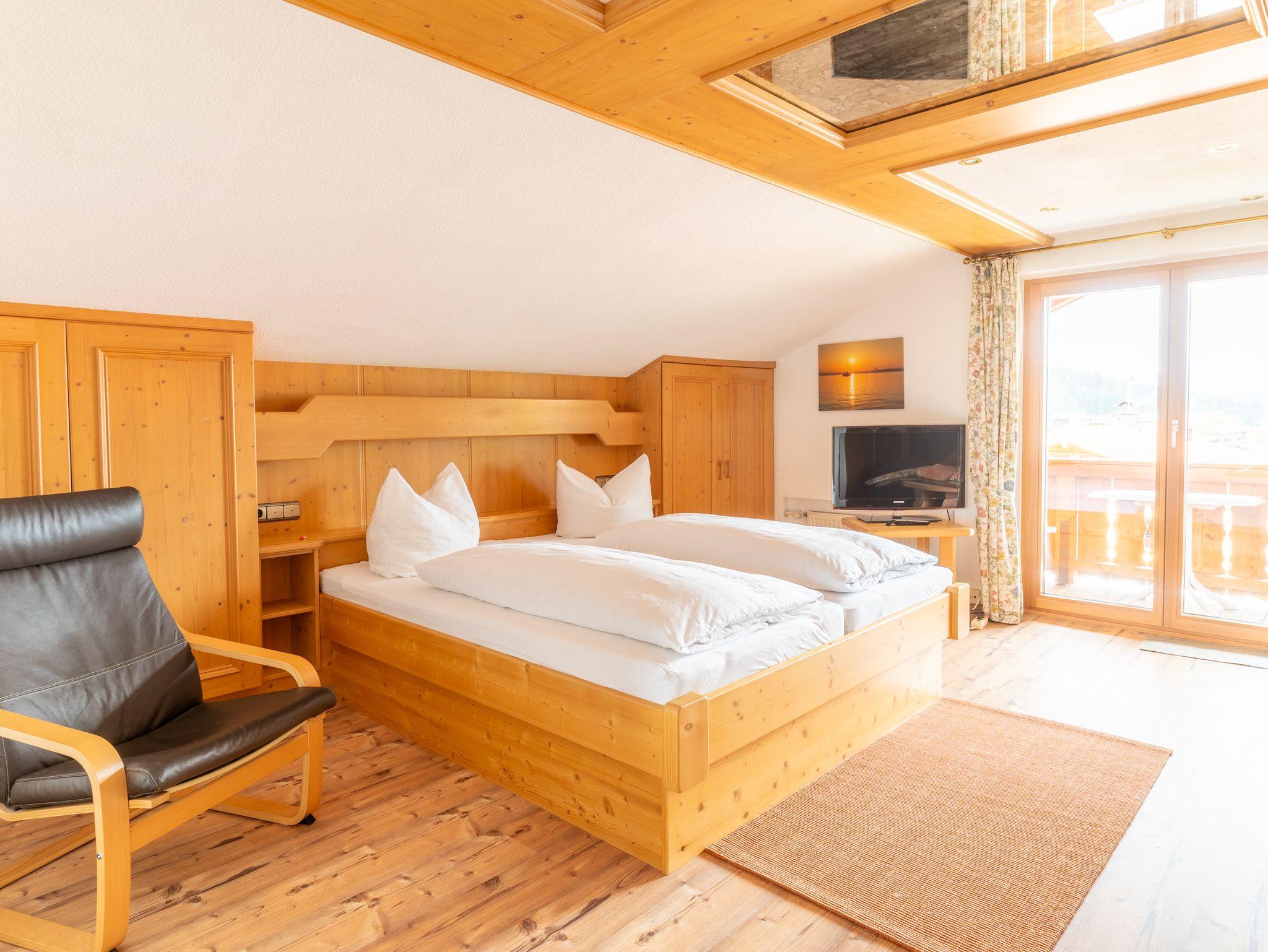 Die ideale Familien-2-Raum-Wohnung ist ca. 50 qm groß und erstreckt sich über das gesamte Dachgeschoss. Im vorderen Bereich der Wohnung befinden sich ein Doppelbett in Komforthöhe (1,80 m x 2,00 m) und ein gemütlicher Wohnbereich mit Schlafsofa, im mittleren Teil ist das Esszimmer mit sehr gut ausgestatteter neuer Küchenzeile (Spülmaschine, Toaster, Wasser- und Eierkocher etc.) und ein Badezimmer. Das zweite Schlafzimmer mit zwei Einzelbetten mit einem eigenen Badezimmer befinden sich im hinteren Teil. Von den beiden Balkonen haben Sie einen schönen Blick auf die umliegende Bergwelt und in den Garten.