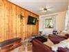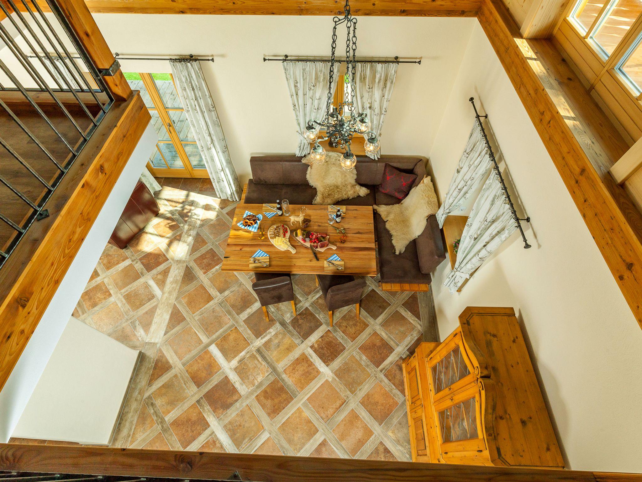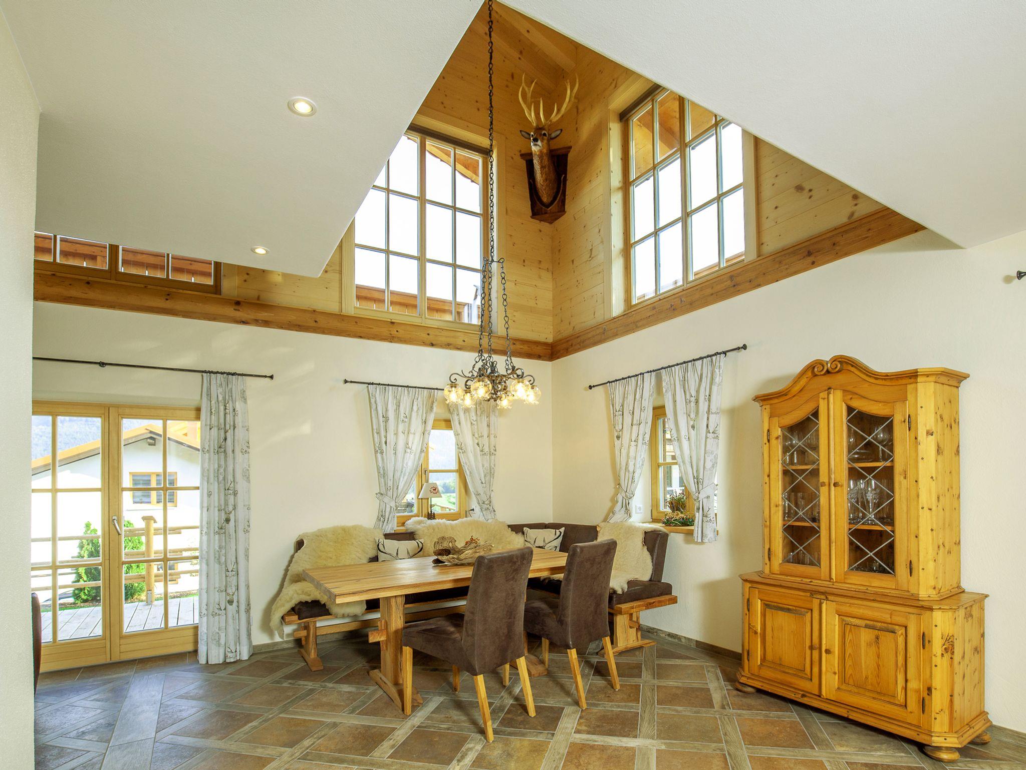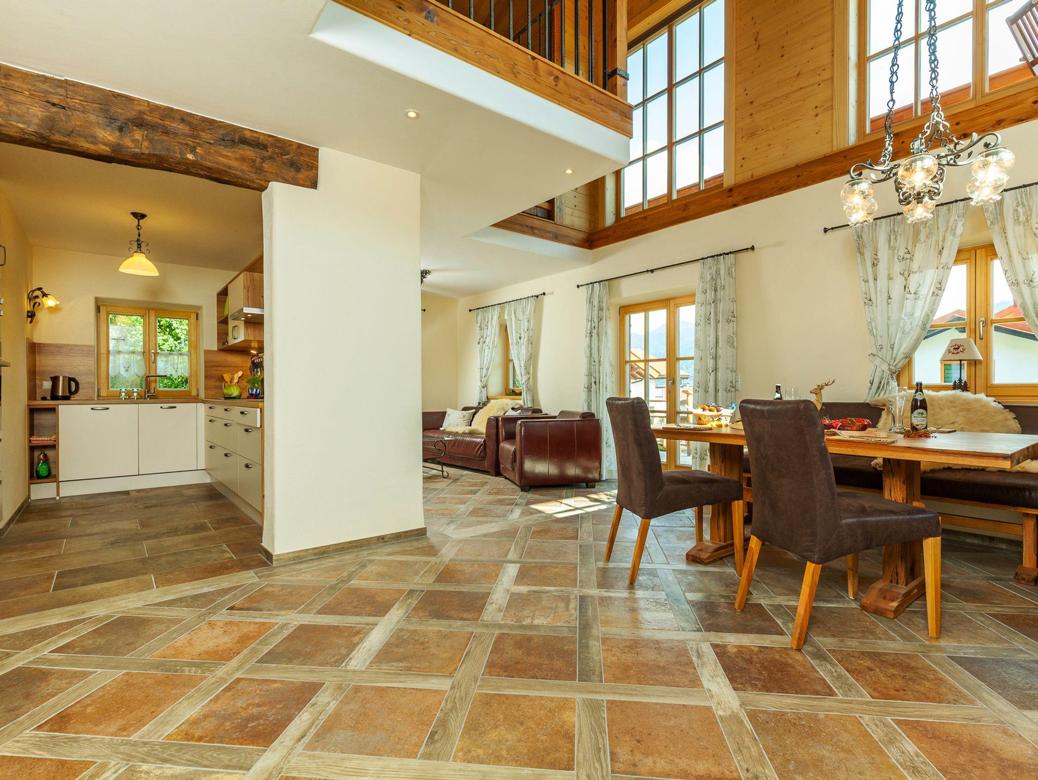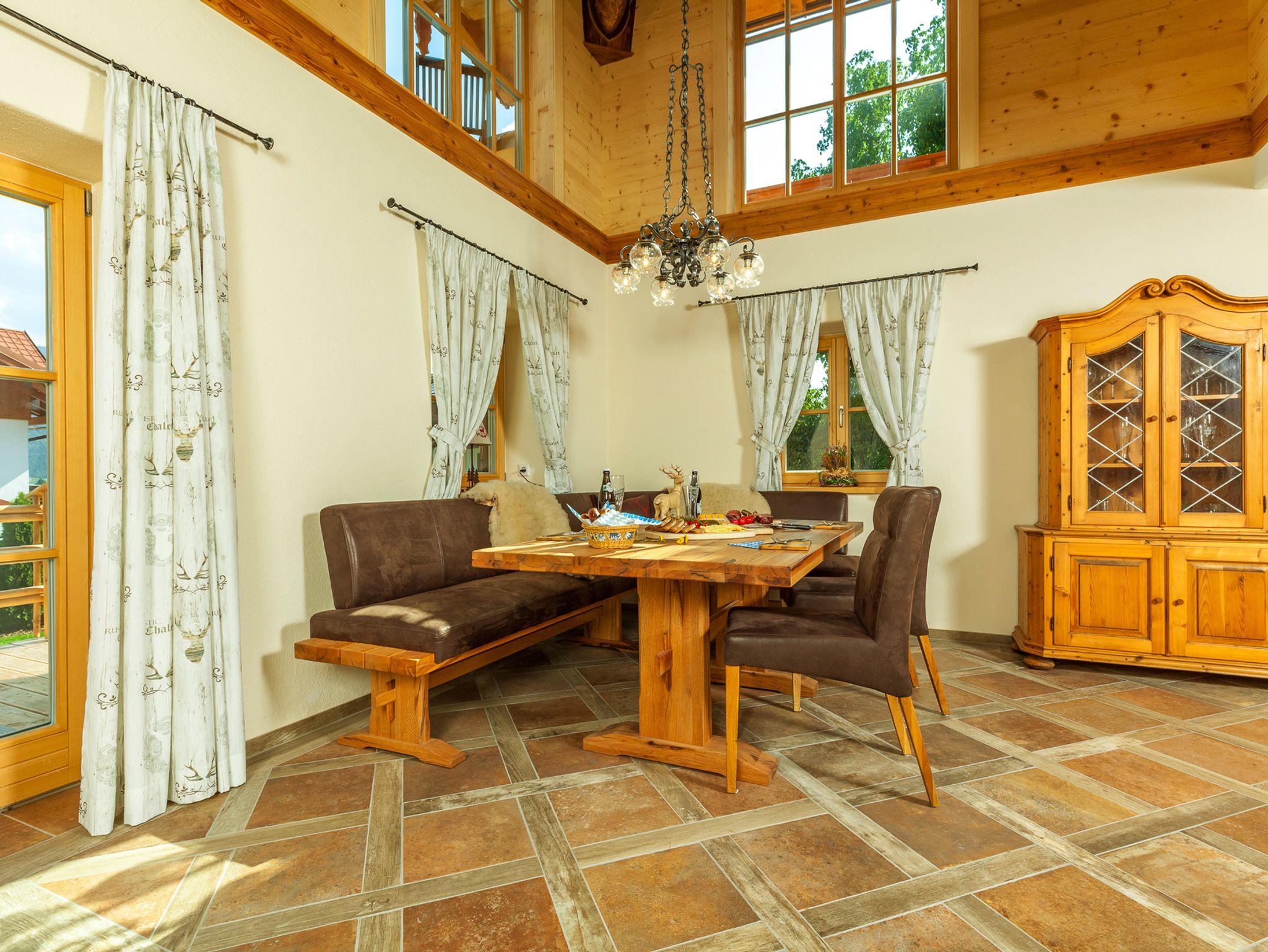 Im Erdgeschoss, ein Essbereich der über eine Empore einen freien Blick bis zum Sichtdachstuhl des Holzobergeschosses mit seiner imposante Hirschkopftrophäe erlaubt; ein Wohn- Fernsehbereich mit Zugang zur Terrasse; eine komfortabel und modern eingerichtete Küche.
