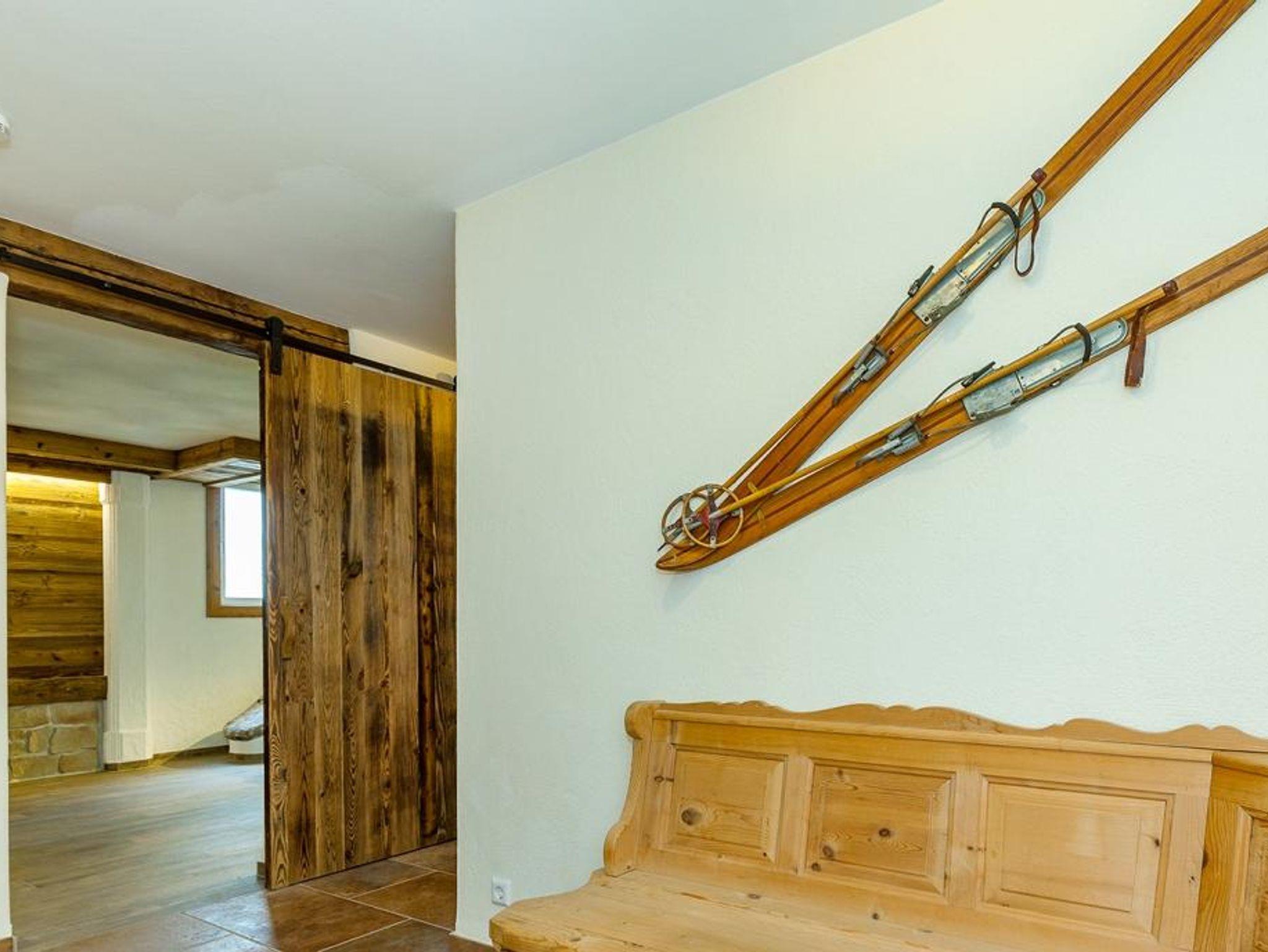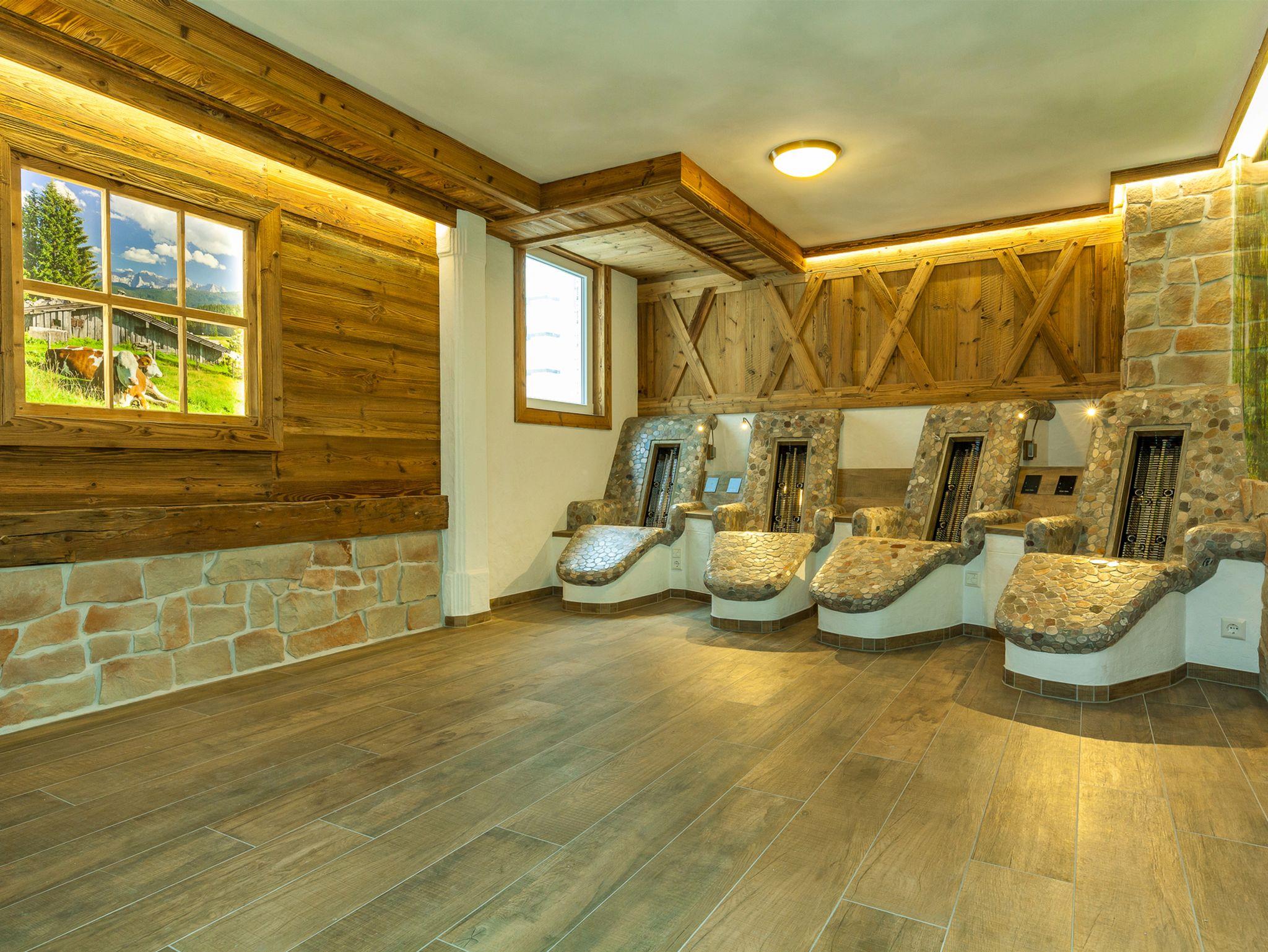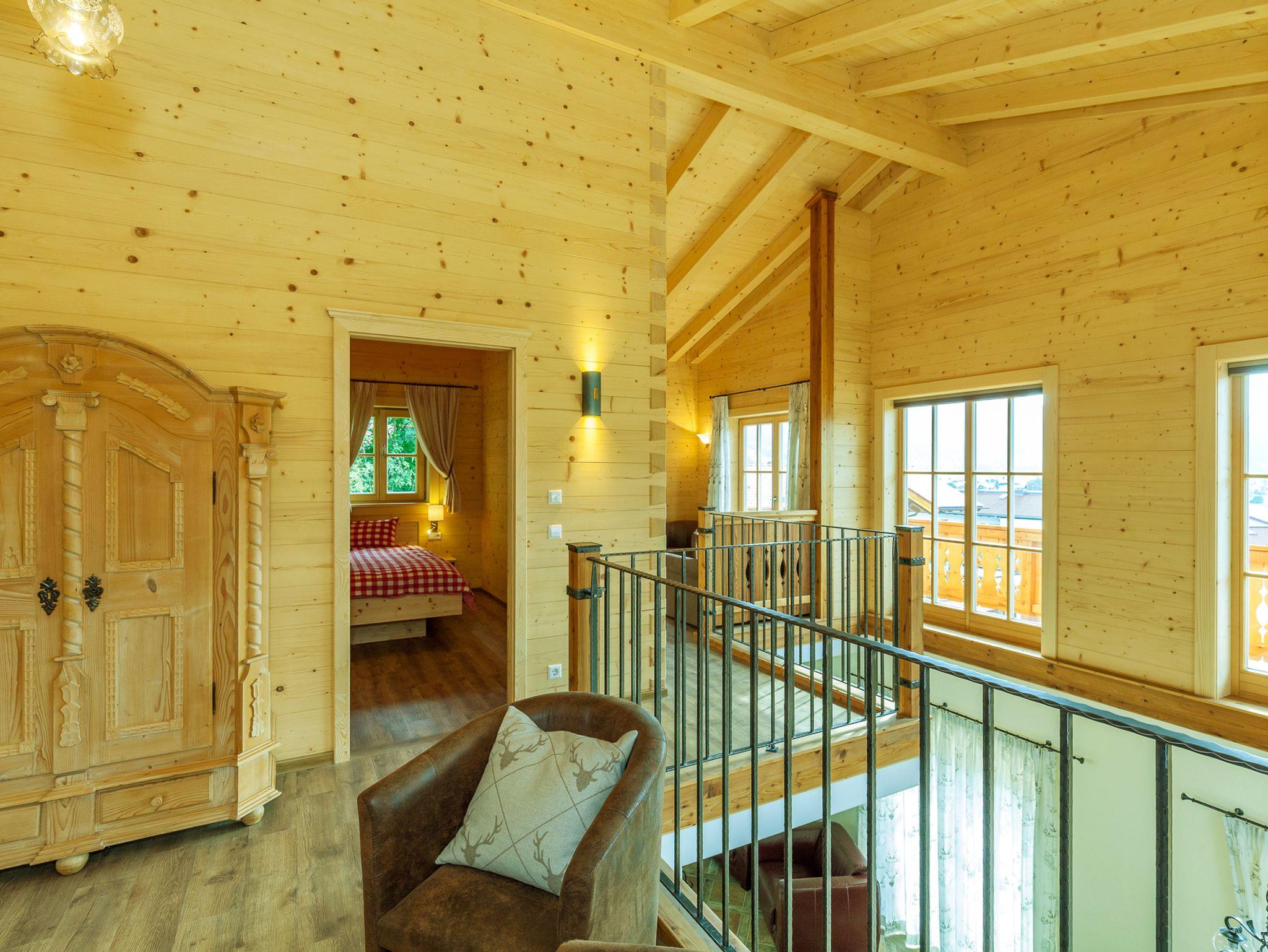 Im Obergeschoss befindet sich eine Galerie mit einer behaglichen Sitzgruppe ergänzt durch eine gemütliche Bibliothek. Schmiedeeisen und Altholz bilden hier die akzentuierenden Stilelemente. Zum großen Balkon von dem Sie das umliegende Bergpanorama besonders gut genießen können, gibt es von hieraus zwei Zugänge.
